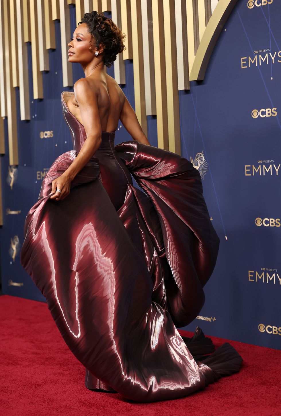 One of the true delights of the Emmys is the moment when an actress I was not familiar with comes out swinging in a dress I adore. This is one of those moments. We've seen numerous plays at this cut of gown on the carpet, but never anything quite like this detailing down the front. The dress comes courtesy of Jonathan Cohen, who I've clocked on all the actresses we've loved of late. Bravo to everyone, including stylist Cat Pope!