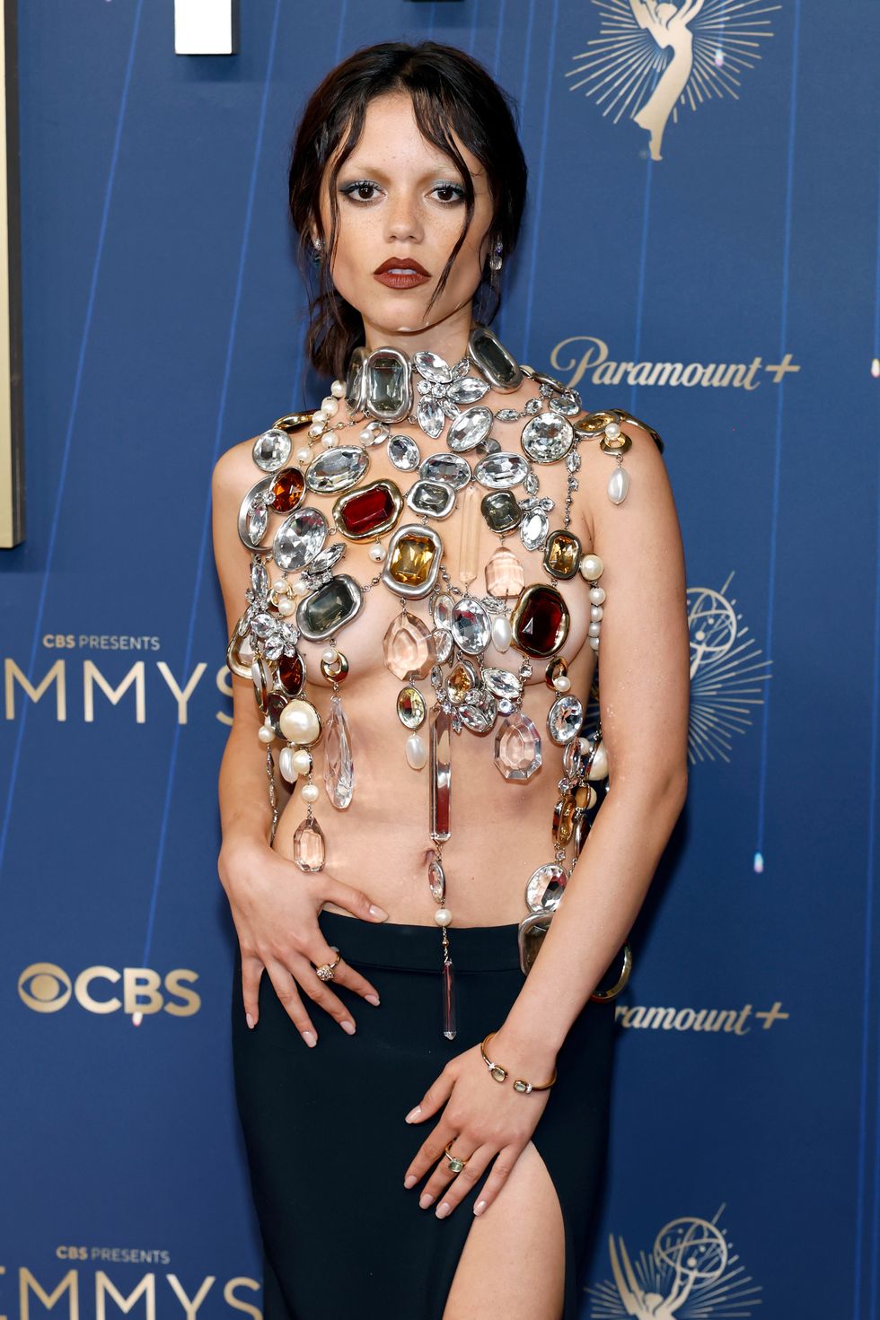 Trends include monochromatic beading, super-short hairstyles and dramatic menswear silhouettes, which are mostly always on-trend except for those few years at Valentino where we were drowning in tulle. Pins were emblazoned on lapels and Meg Stalter wore jeans and a white t-shirt. Sydney Sweeney inflamed her critics in crimson red while Kristen Kish forgot her shirt — to my great pleasure — and Jenna Ortega re-asserted her dominance as the queen of spooky glamor.