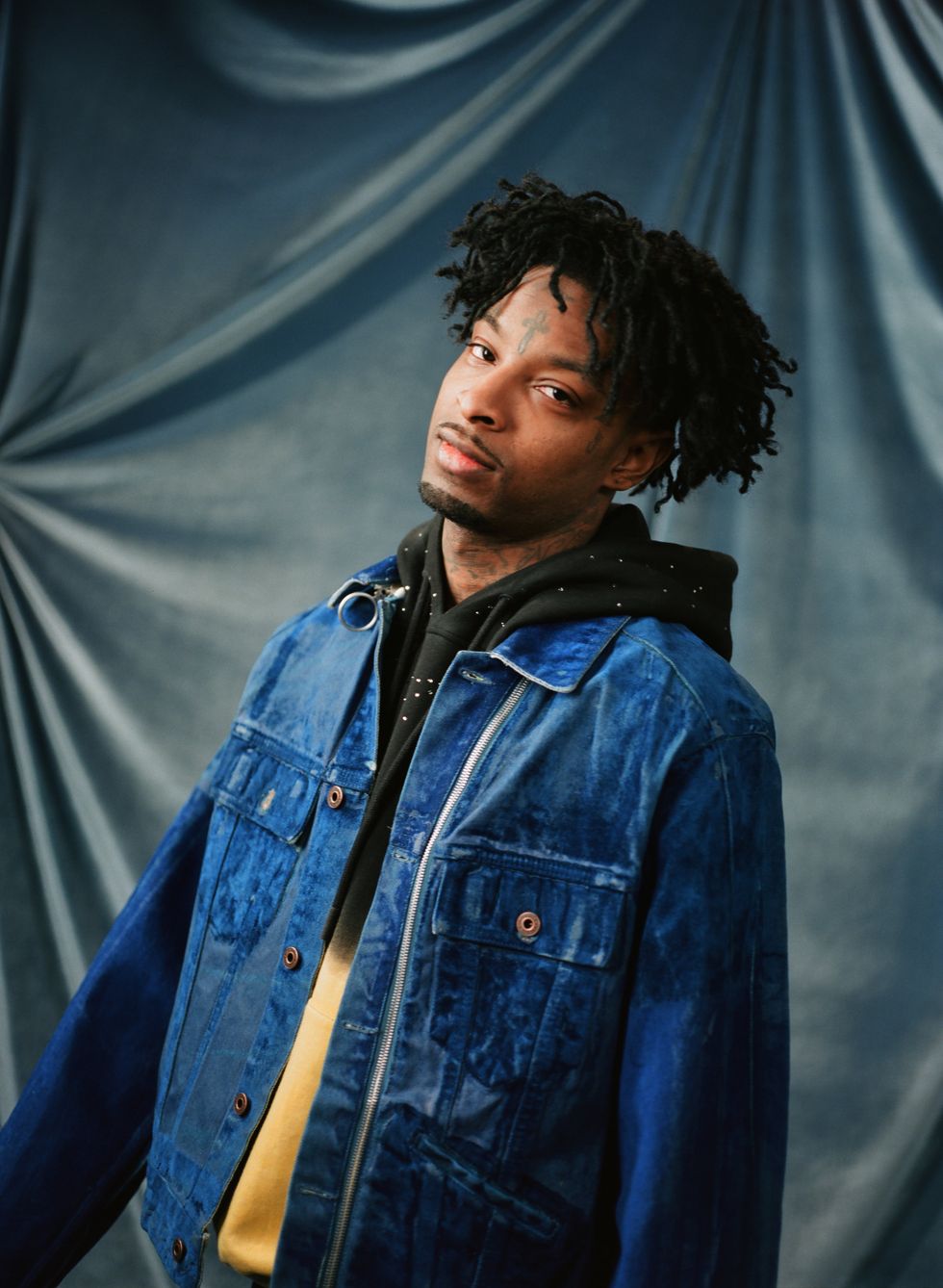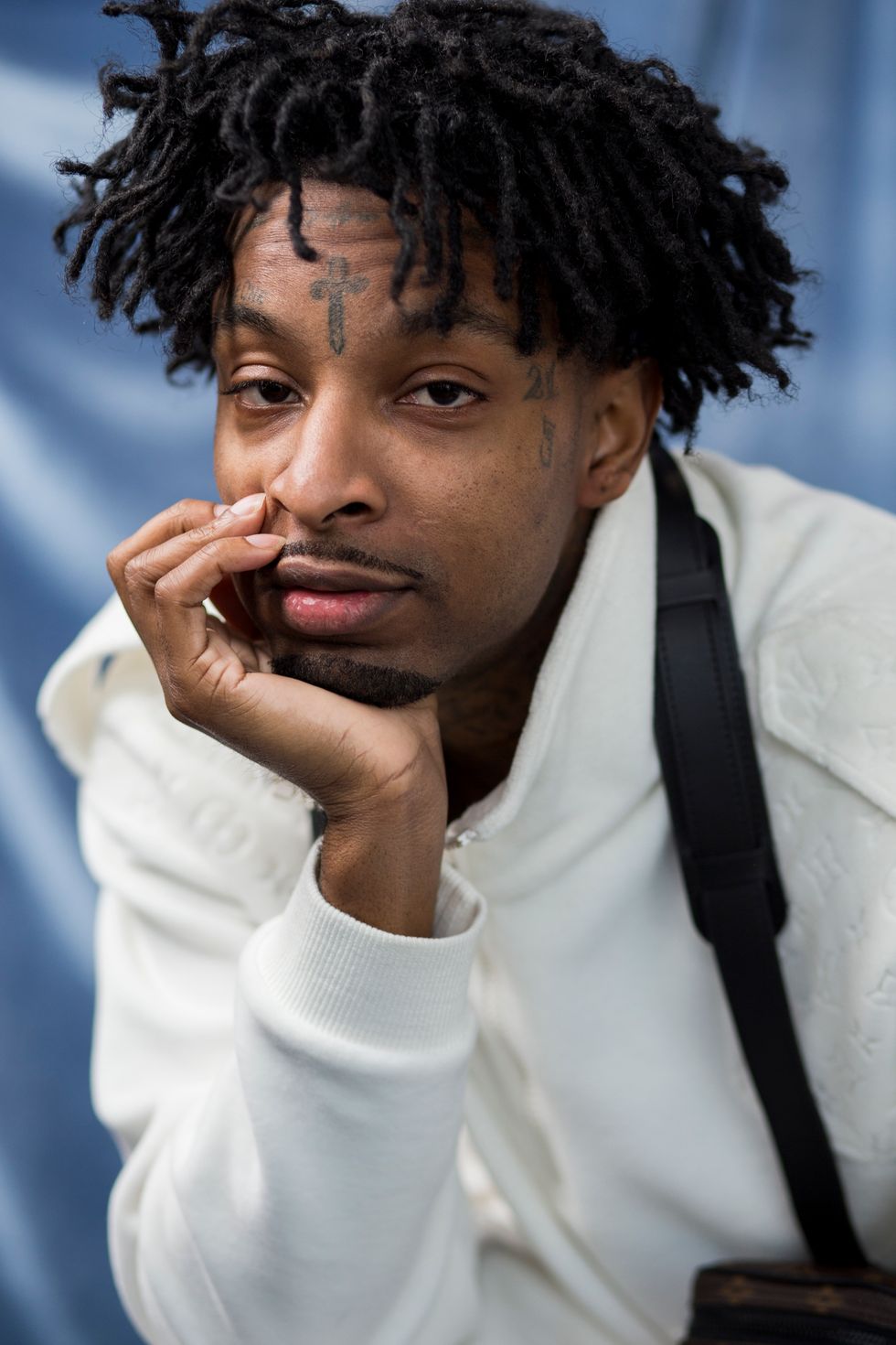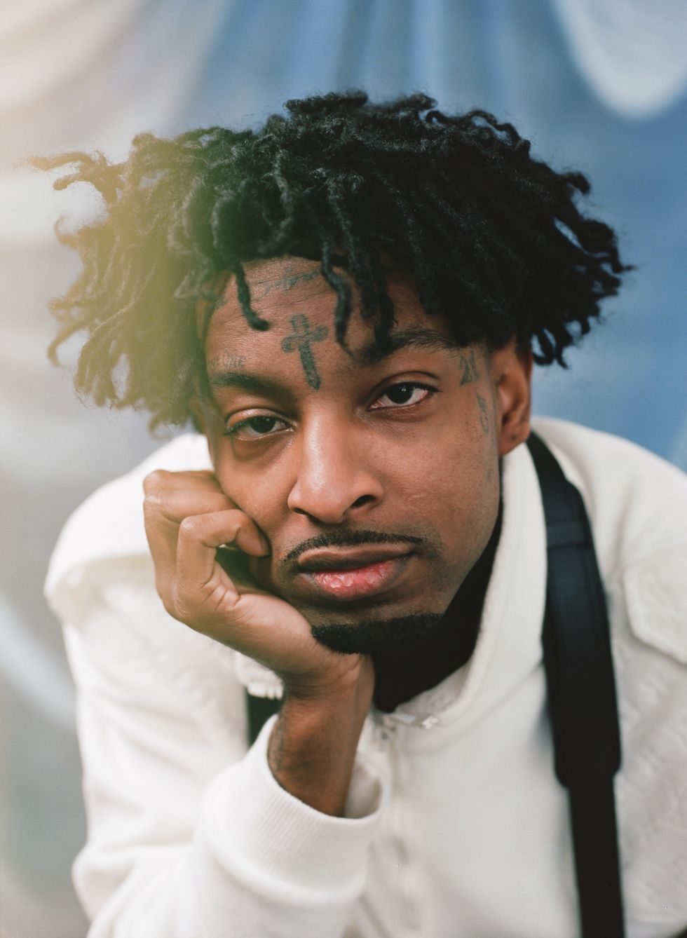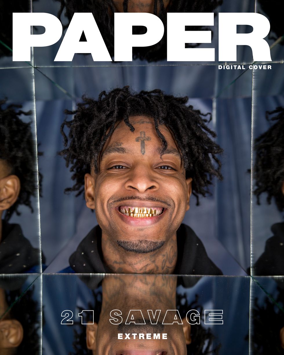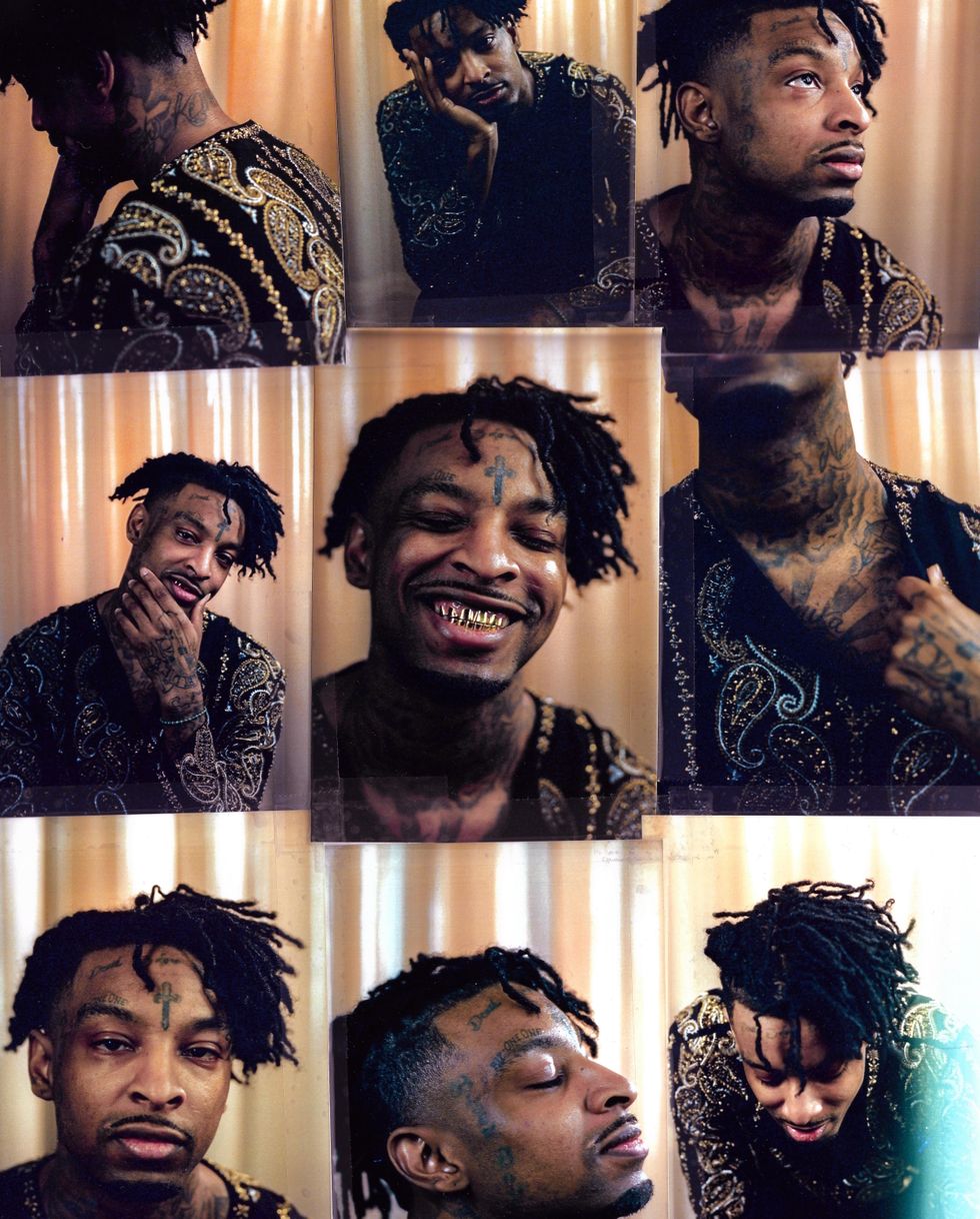 Existing as a Black person in America has always been complicated. The pain and triumph of history can feel as if they are imprinted into the very bones that are our substructure. Perhaps that is why when we gather in close quarters we theorize about these histories. Whether conspiratorial or evidence-supported, the act of conversation is a balm, a way to unpack terrifying realities and to make sense of the senseless, the brutal or the unjust. Hip-hop artist 21 Savage isn't known for being particularly verbose, but has become central to increasing dialogues about Black immigrant experiences. Yet as he perches on a wire-frame chair in a downtown LA studio awaiting the arrival of his barber, it would appear the entire world exists solely on his phone.