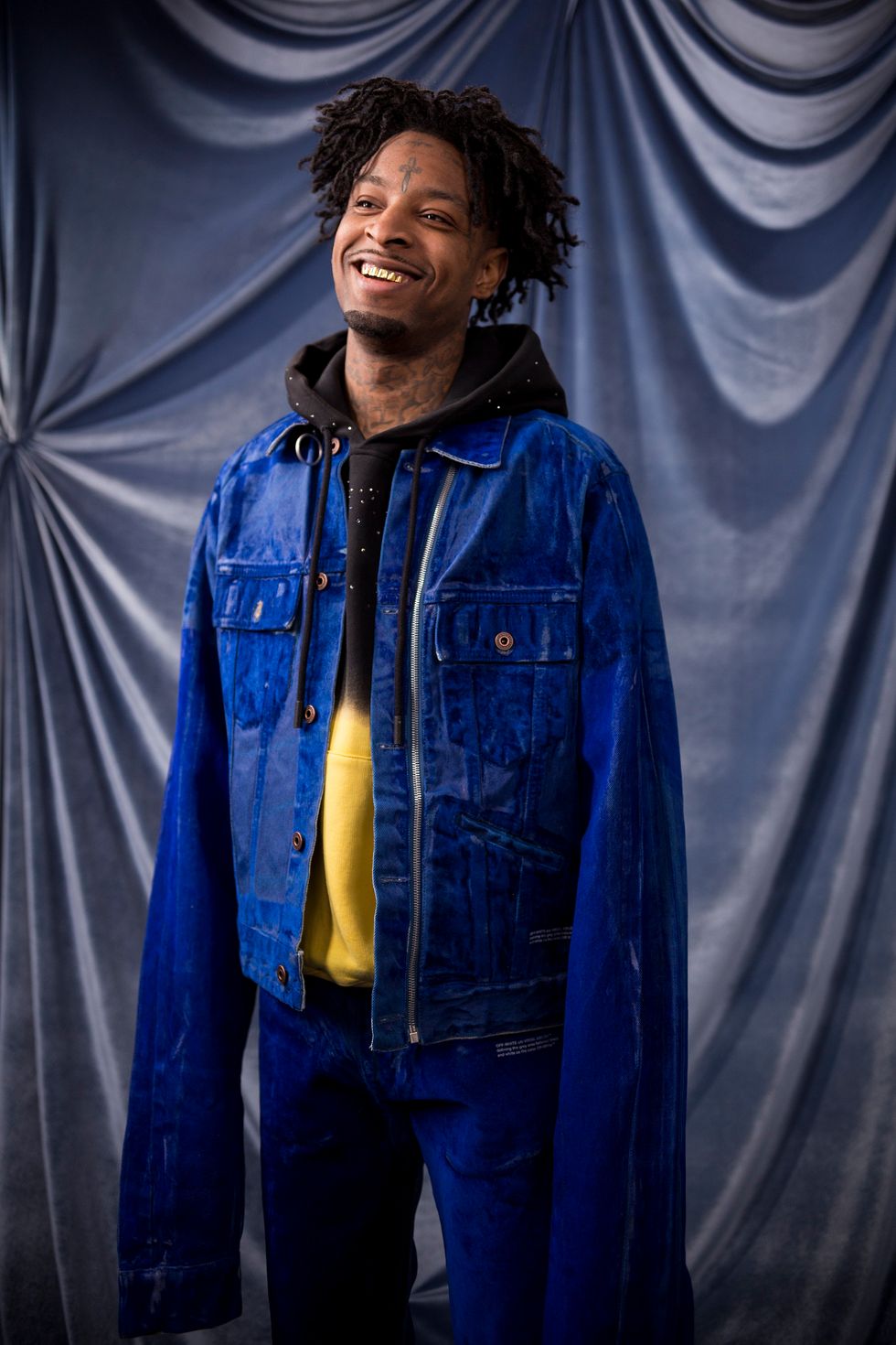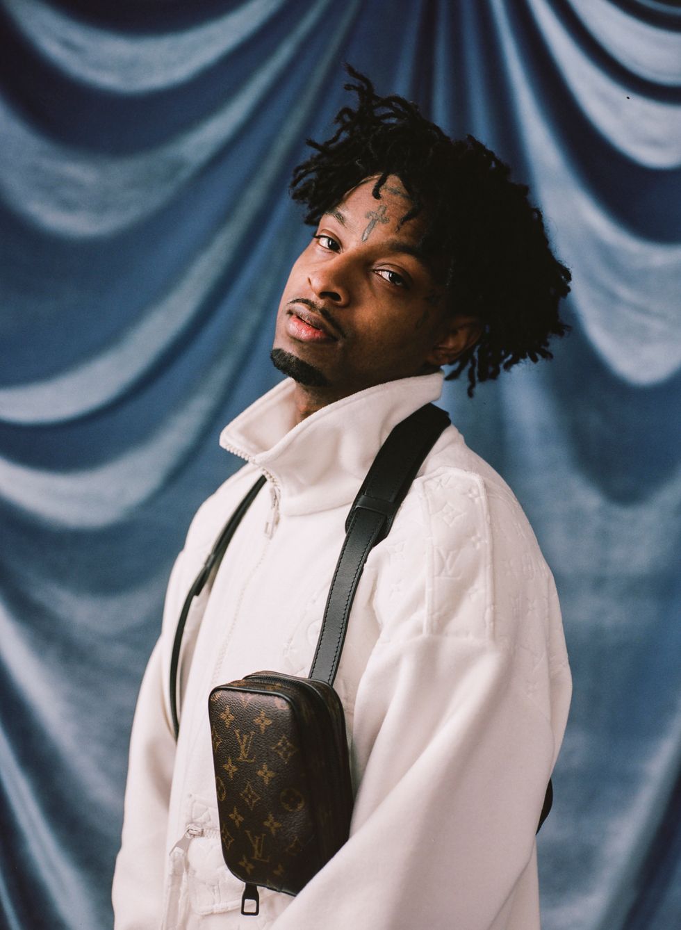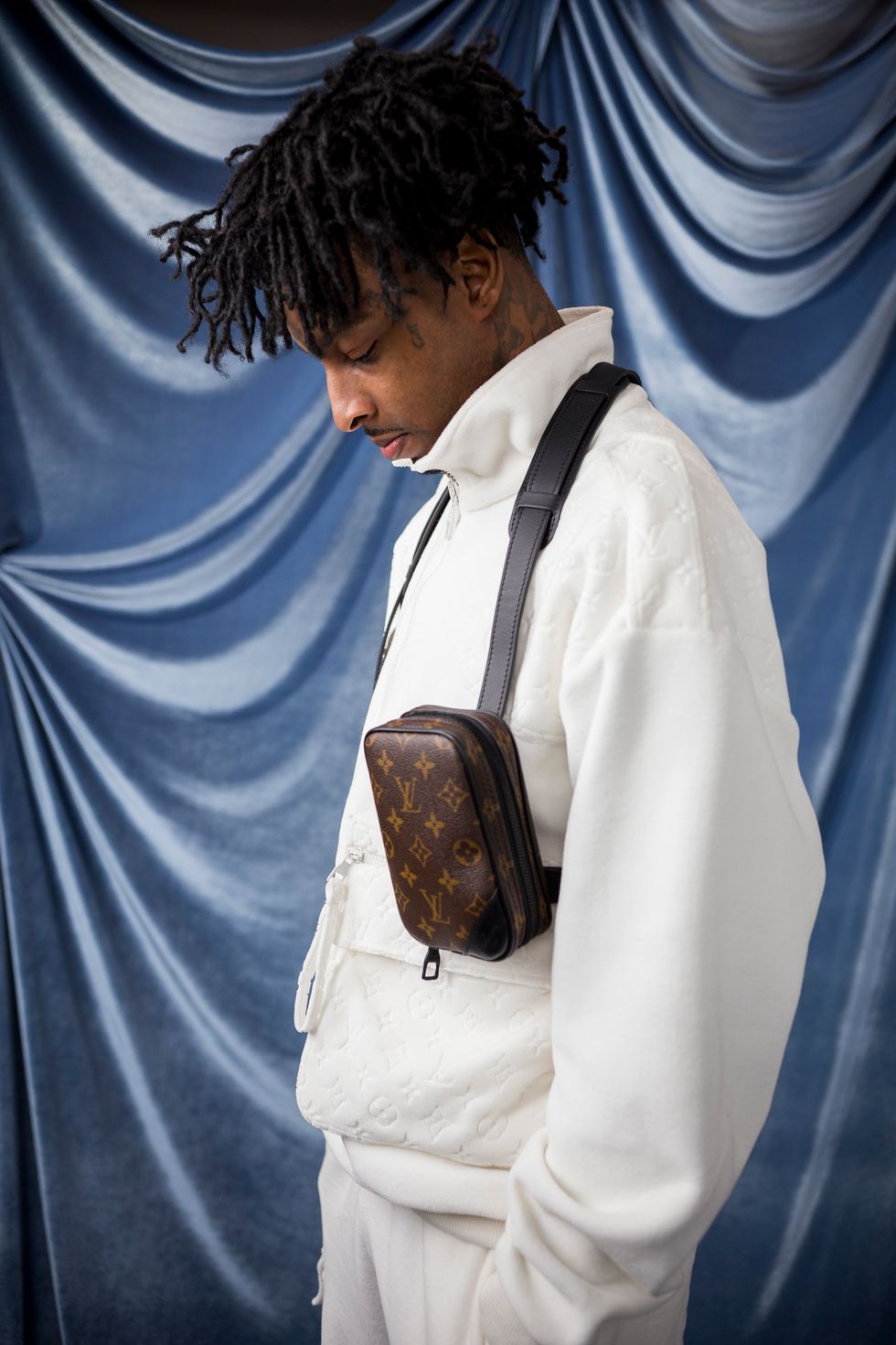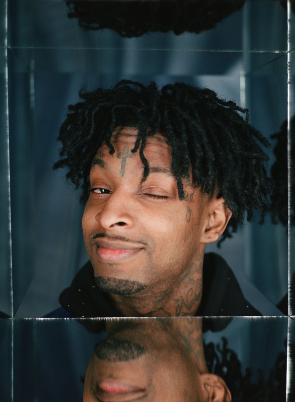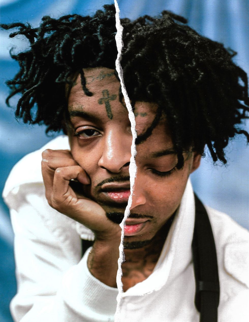 Existing as a Black person in America has always been complicated. The pain and triumph of history can feel as if they are imprinted into the very bones that are our substructure. Perhaps that is why when we gather in close quarters we theorize about these histories. Whether conspiratorial or evidence-supported, the act of conversation is a balm, a way to unpack terrifying realities and to make sense of the senseless, the brutal or the unjust. Hip-hop artist 21 Savage isn't known for being particularly verbose, but has become central to increasing dialogues about Black immigrant experiences. Yet as he perches on a wire-frame chair in a downtown LA studio awaiting the arrival of his barber, it would appear the entire world exists solely on his phone.