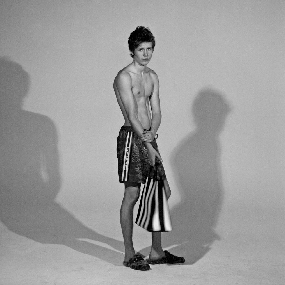 On Fionn: Shorts & Shoes: Gucci, Bag: Michael Kors