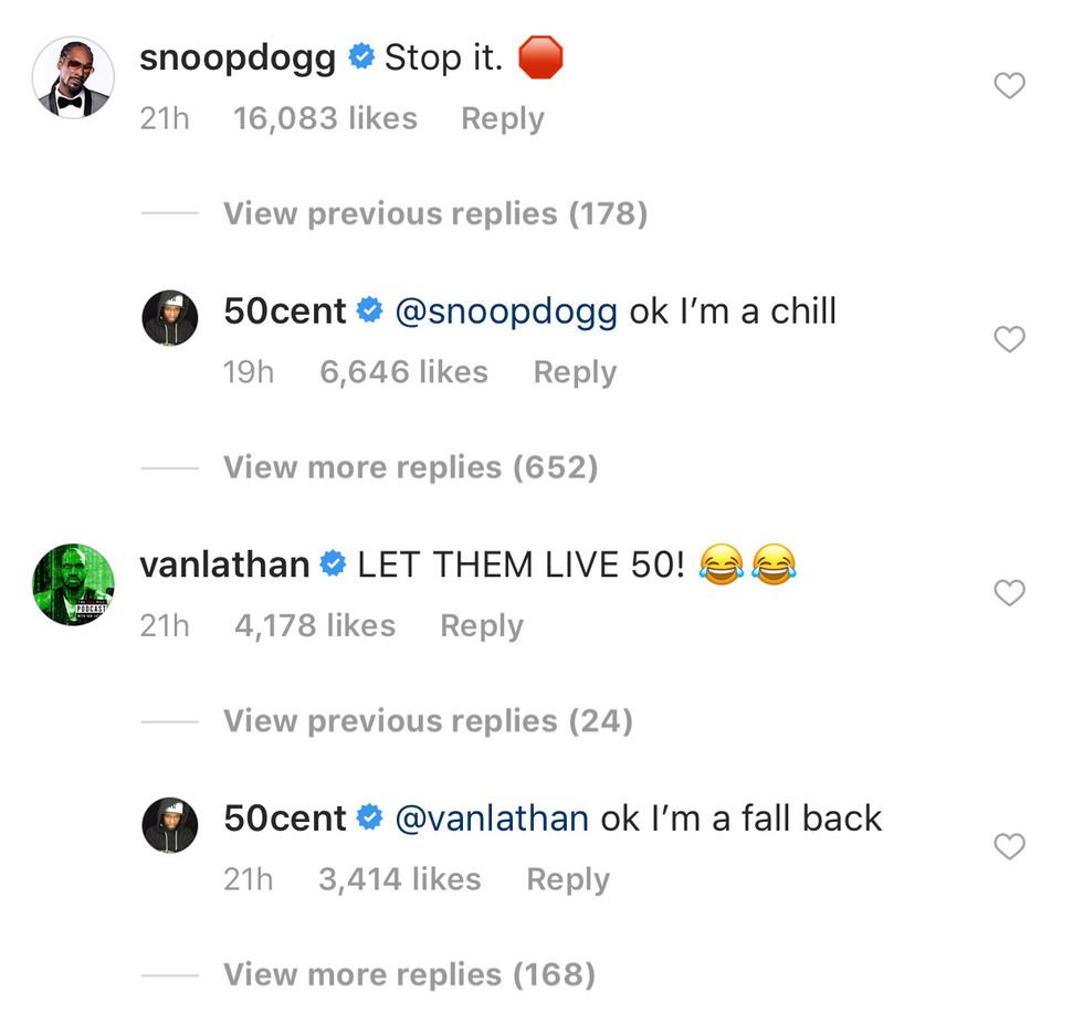 Personalities like rapper Snoop Dogg and Van Lathan have commented, urging 50 Cent to “Stop” and to “Let [JaRule] live.” But it doesn’t seem like any of this will change his mind. He also posted a statement that seems to address his critics who think he’s gone too far with this power move. He said, “I’m the judge when enough is enough,Suckers don’t deserve mercy.I have no sympathy, I’m fresh out of empathy.”