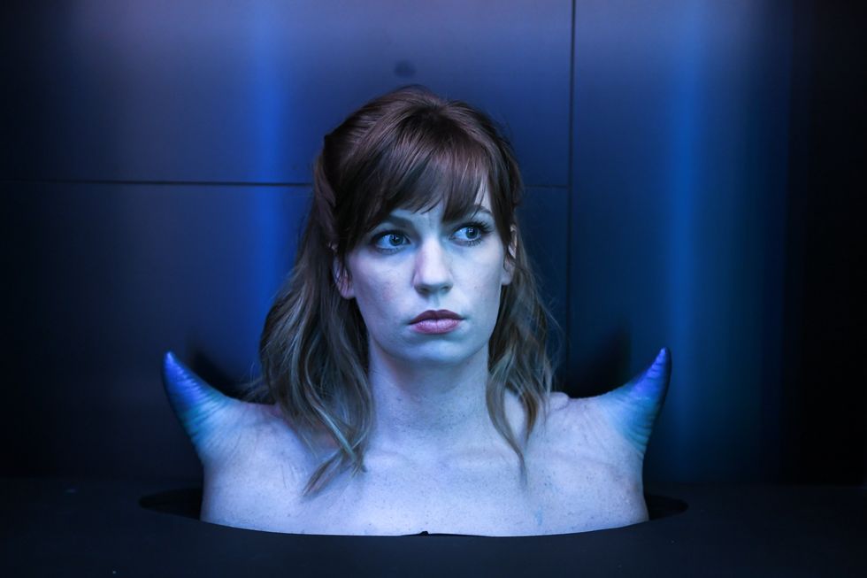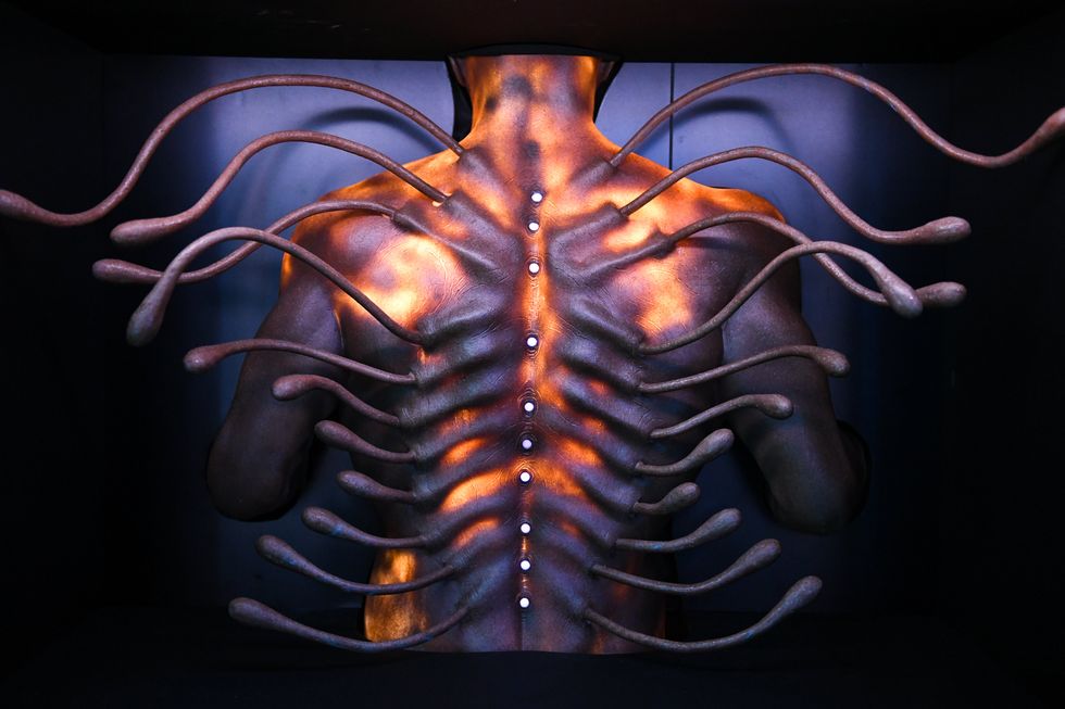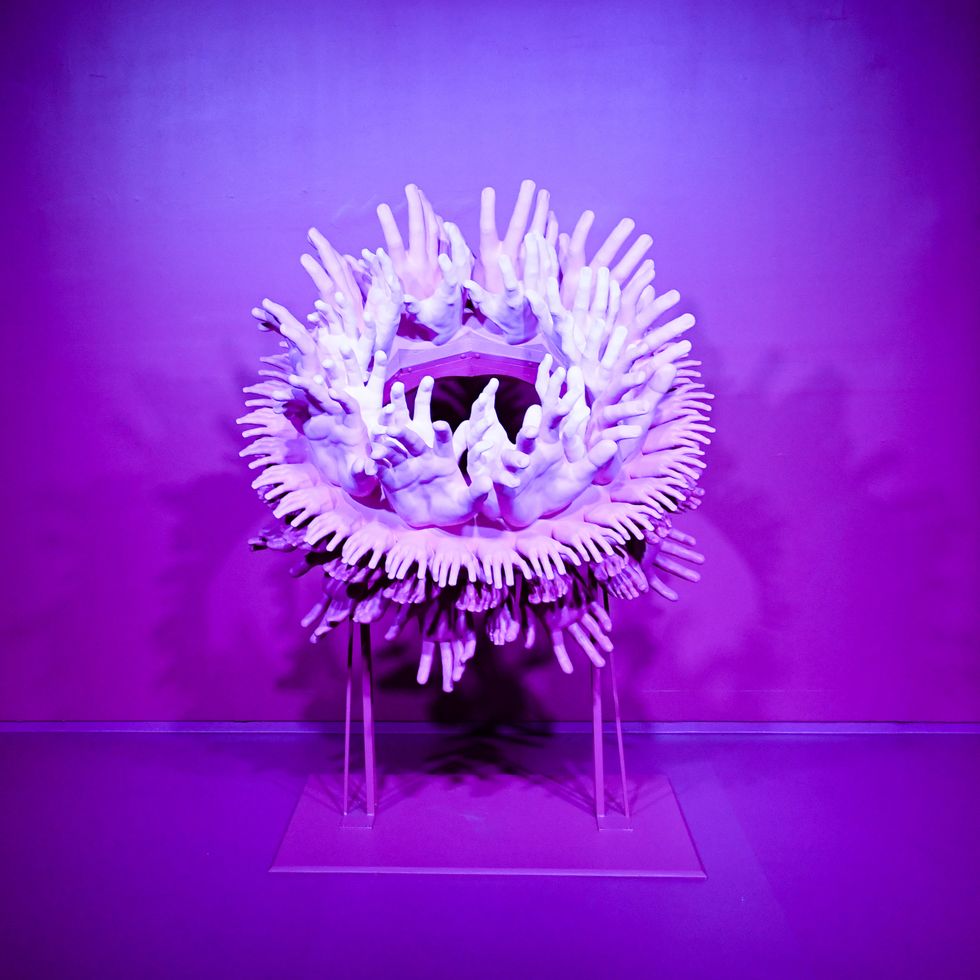Huck is selling A. Human as a "futuristic fashion brand." The exhibition, where realistic prosthetics like fish gill-like collars and exaggerated pointy shoulders are displayed on real life models, is a version of something like Sleep No More, a living experience that plays on the idea of shopping in the future — a world where, theoretically, people would slice and dice themselves to get the look (the plastic surgery jokes write themselves).