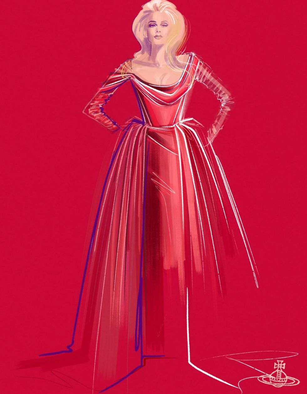 She also wears a custom corseted dress in scarlet red satin with silk tulle bolero and train from Vivienne Westwood's couture line (which is only available in the brand's London, New York and Los Angeles shops) paired with Cartier jewelry.