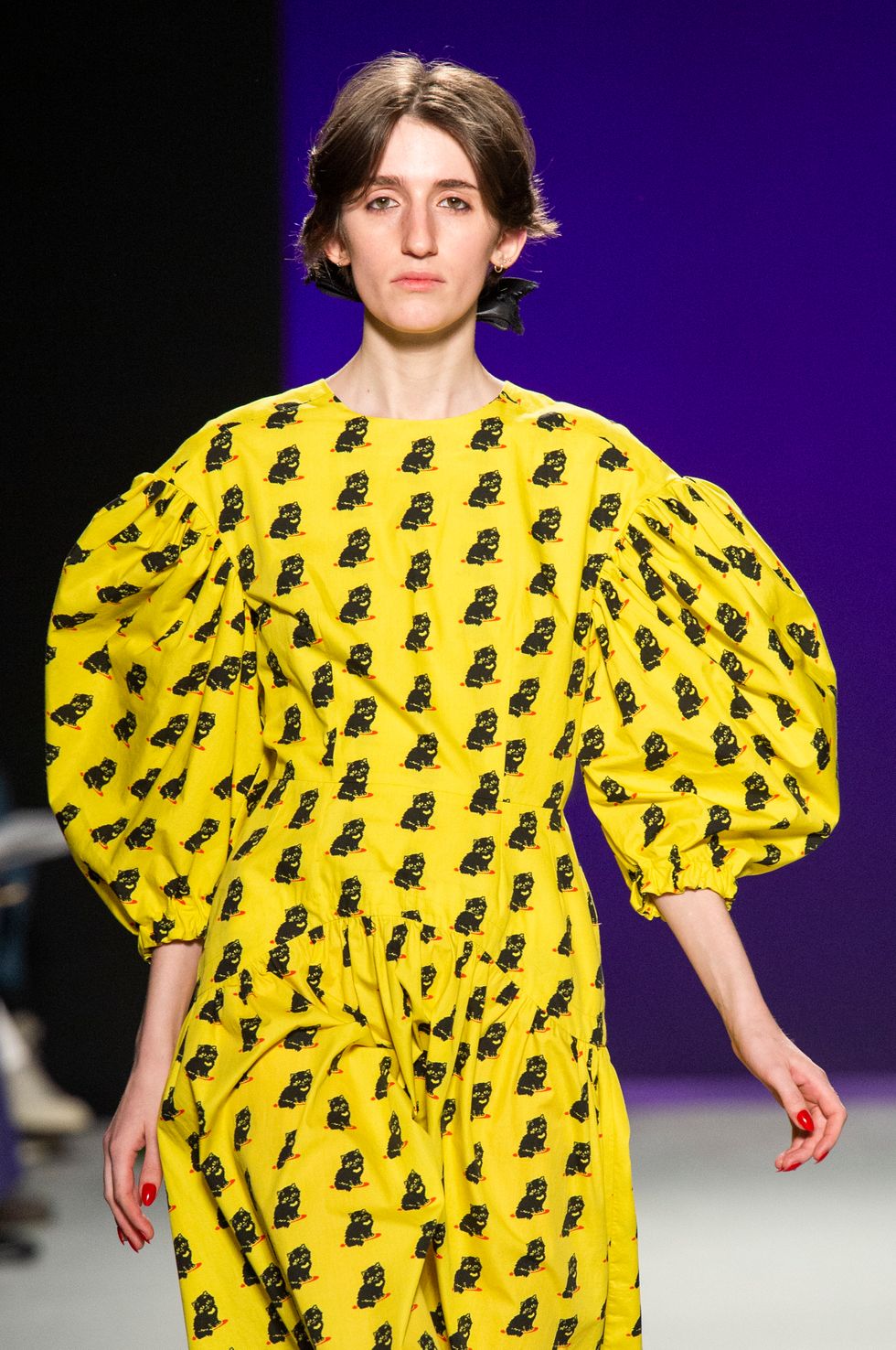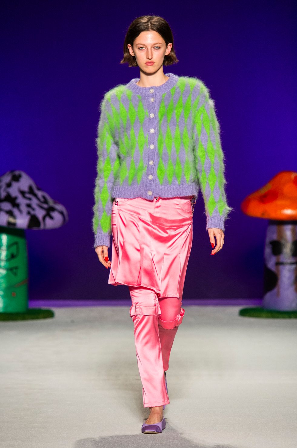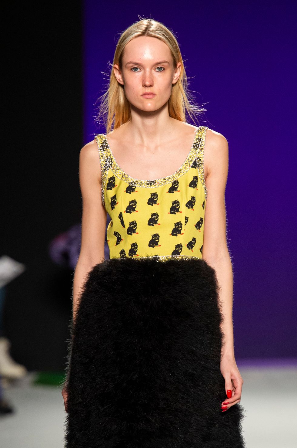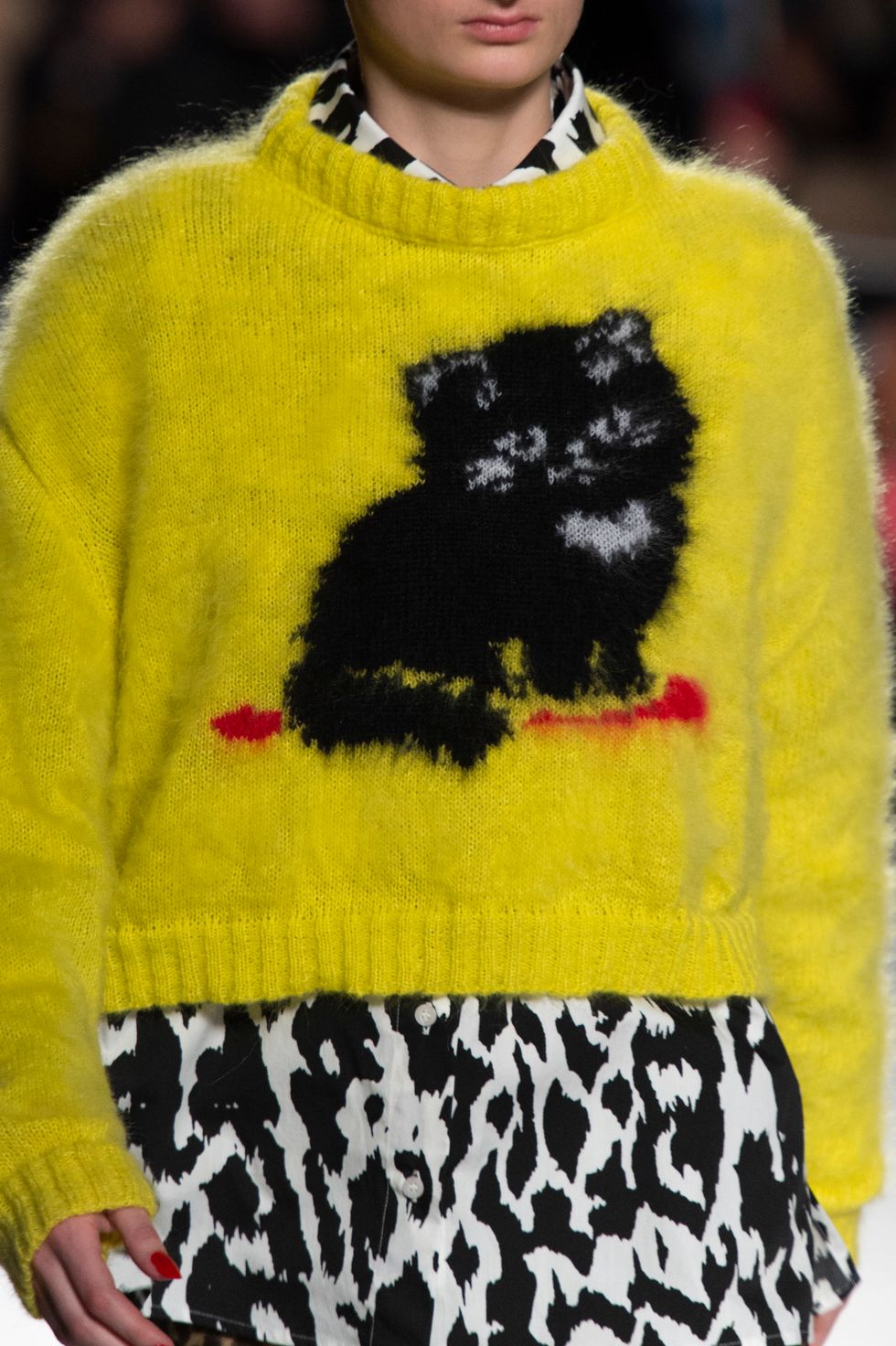 Capitalizing on the granny look, one bright and fuzzy yellow sweater with a black cat (a motif used by the brand in the past) really stood out. Another pink mohair skirt and matching sweater was covered in mini black cat silhouette.