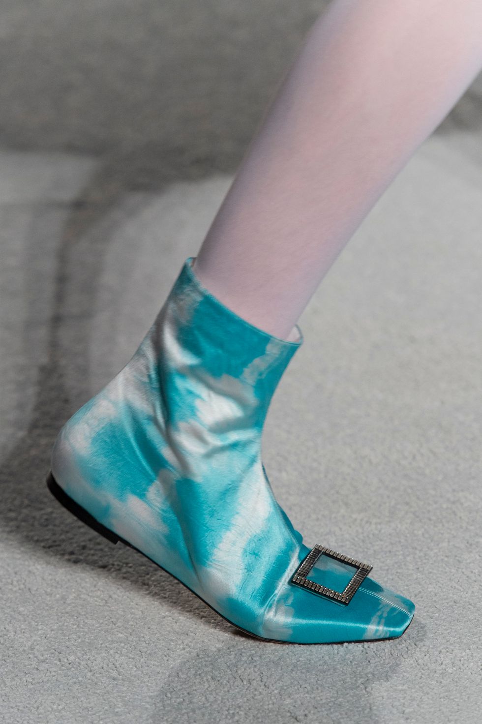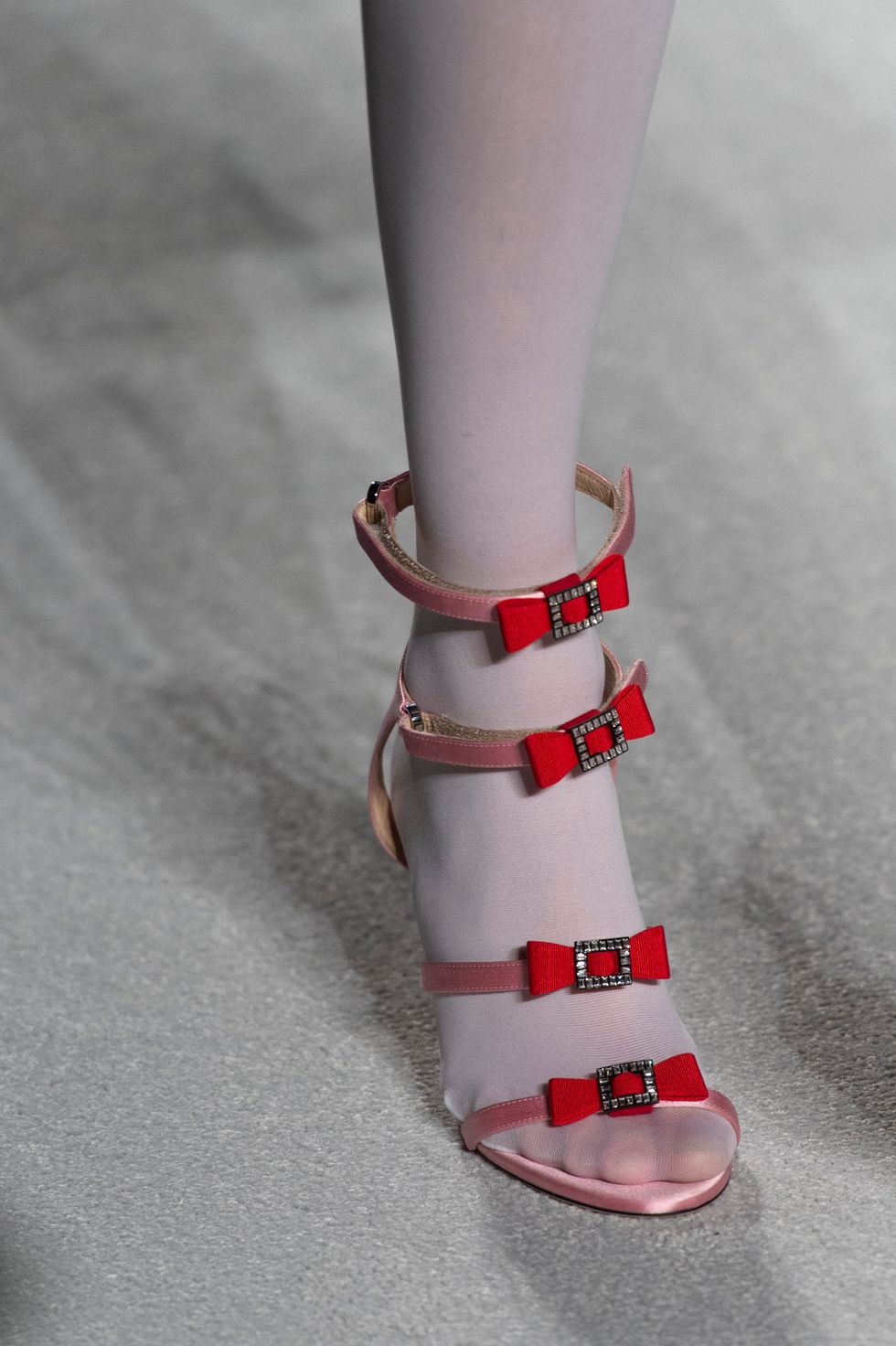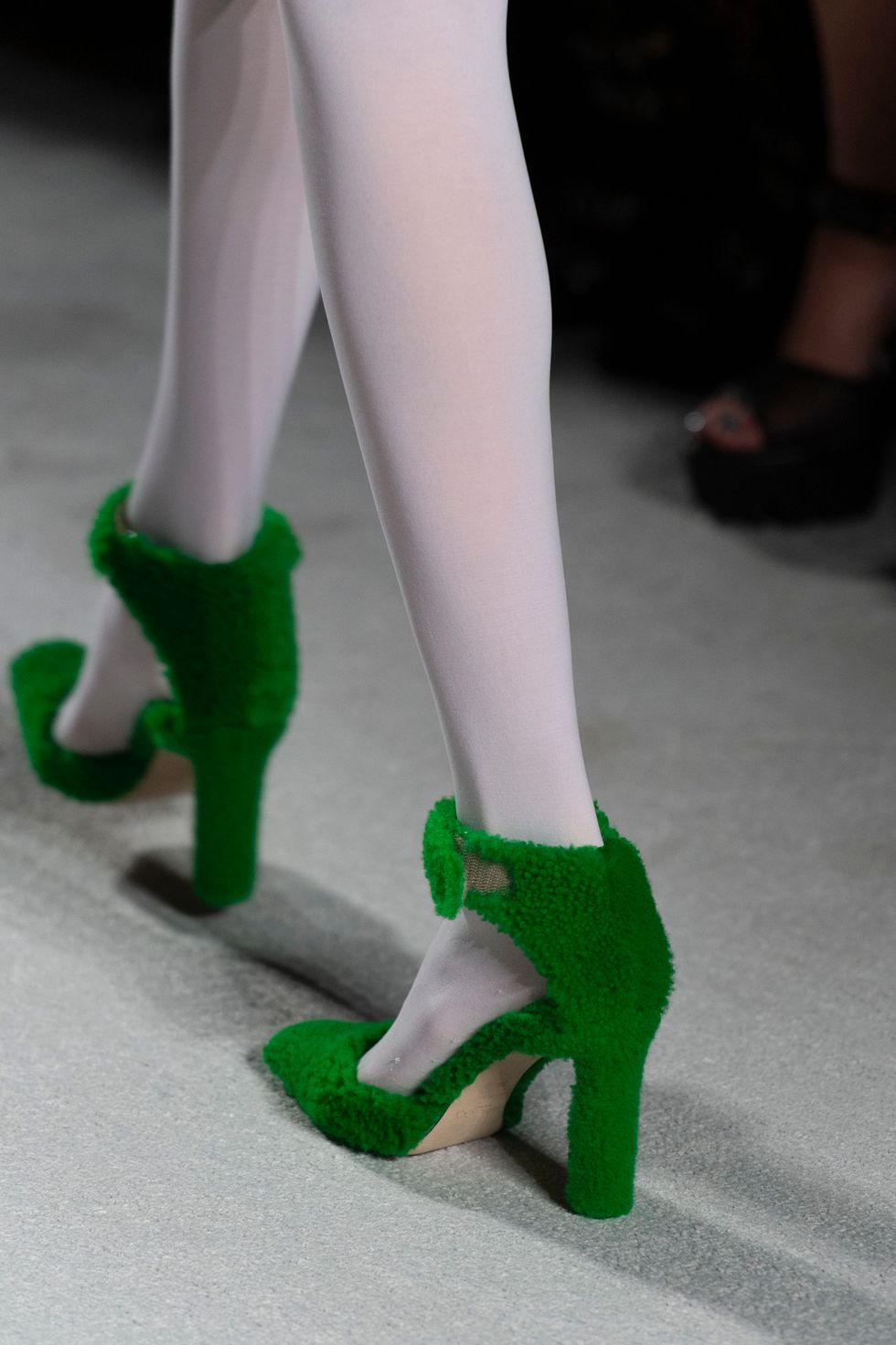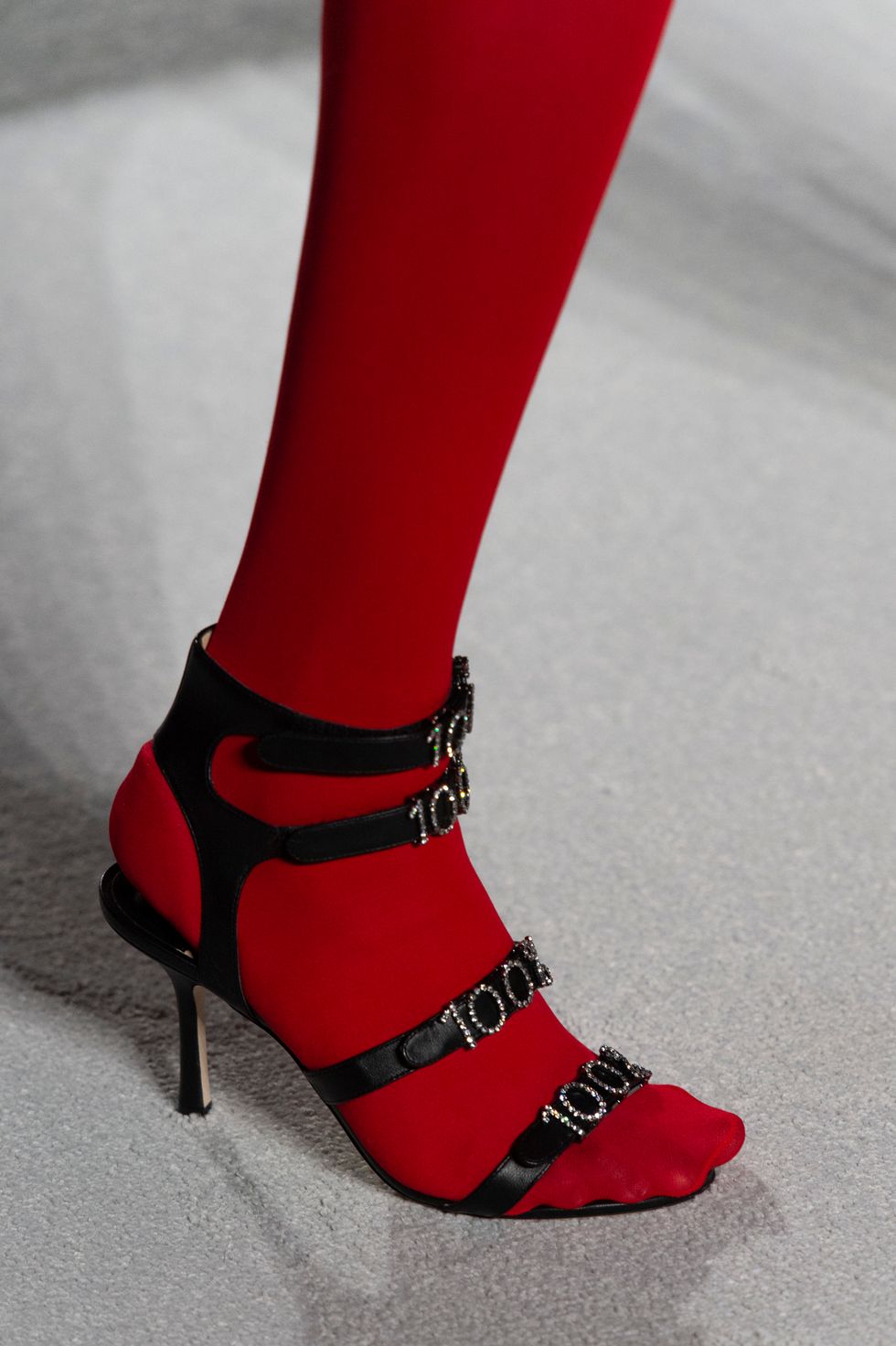 A highlight of the collection was the shoes — a collaboration with Jimmy Choo. Fans of the brand may have noticed a signature of the brand was notably missing this season: the glittery crystal hair clips in ironic phrases like "sex" and "anxiety." However, the shoes this season replaces those aforementioned clips. Strappy heels and black flats were covered in crystal "100%" phrases.