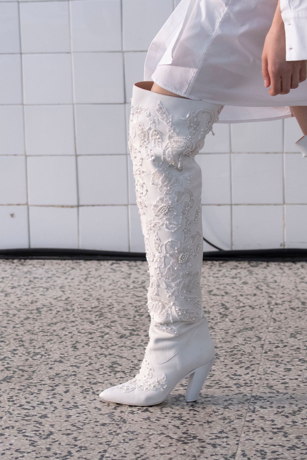 A pair of blinding white thigh high boots that stole the show and our hearts this season. Featuring an ornate mix of pearls and lace detailing, the bedazzled boots made an appearance throughout the show but looked best paired with an oversized silk hoodie with sensual lace inserts and the same pearl embroidery.