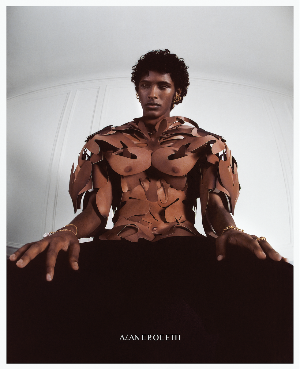 This season, Corcetti was contemplating the idea of sin from conception and the shame and guilt associated with human flesh and bodily sensations. "As I represented on the chastity necklace, morality reduces human desire to the dichotomy of SEX as CORRUPTION," the collection notes read. "As a designer, I personally felt push back for expressing my take on sex and sensuality. Despite relying on romance, art, and poetry, my work has been constantly censored by social media platforms as if my photos could corrupt and desensitize individuals away from preconceived ideas of sacred intimacy."