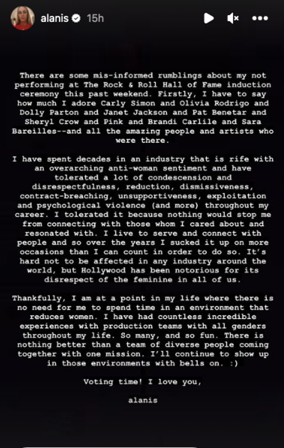 Rehearsals went as normal and Morissette was on all of the in-house schedules. According to a post made on her Instagram story, it appears that something occurred with the production team. She cites being in an industry "rife with an overarching anti-woman sentiment" as the reason for her frustration.