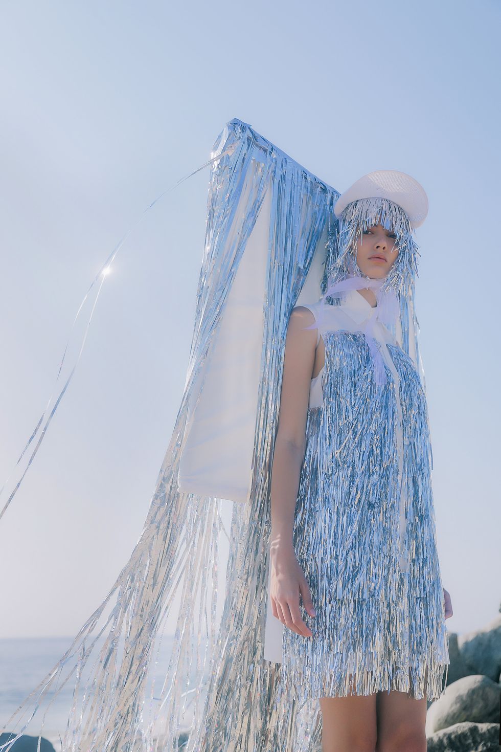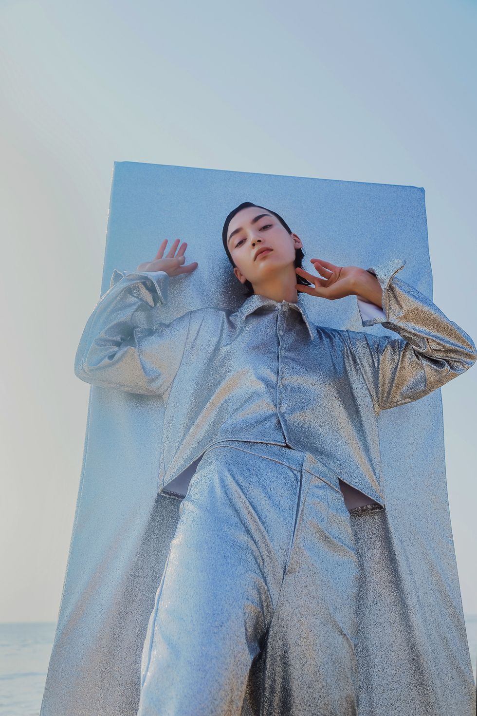 Trincone uses feminine materials, finishes, and silhouettes on the male form, in the manner of designers like Alejandro Gómez Palomo of Palomo Spain. "Why can't men be delicate, neutral, and flamboyant, exactly like women?" he asked. "There are a lot of people like me who want to be more eccentric, different from the classic men's image. But they can't, because of images that society has imposed. My goal is to inspire those people to fight this problem, to be totally, 100% themselves."