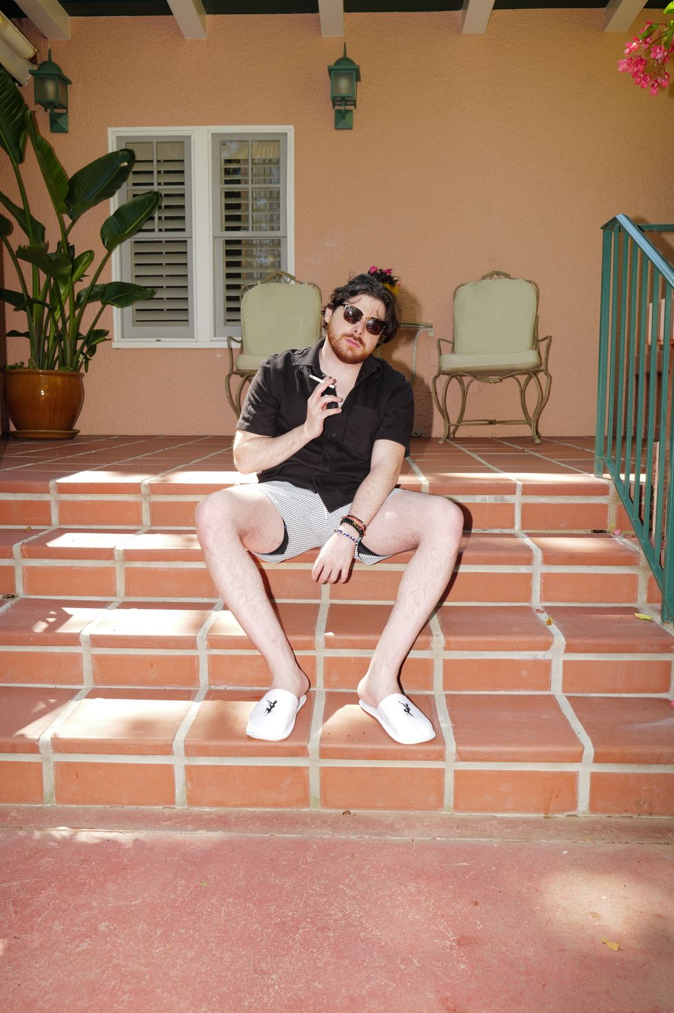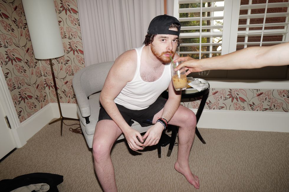 When we meet, he’s in a robe at the Beverly Hills Hotel, sipping a vanilla shake and obsessing over how long it is taking the hotel to bring him cupcakes. A red Kabbalah string hugs his wrist. When a friend on set asks Kazemi who he’s texting, he replies casually: “Lindsay Lohan.” He tells me he once packed up his bags and ditched a Sunset hotel because they wouldn’t bring an Apple TV to the room. He interrogates me about Addison Rae’s music career, then flips the convo to whether I own a Lacoste polo. He puts on puppy dog eyes. “I think some of us do get damaged by the world, but for me, I came into the world with a broken heart. I stand by that,” he adds. “Can you put that in the article?”