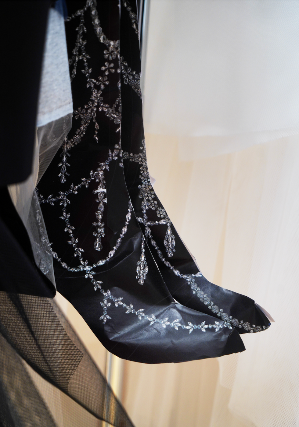 Before pieces are finished, paper scraps are pinned on toiles to construct the exact placement of every thread of embroidery on the final garments. Alexander McQueen uses 3D paper versions to mimic the effect of crystal raindrop embroidery on thigh-high boots.