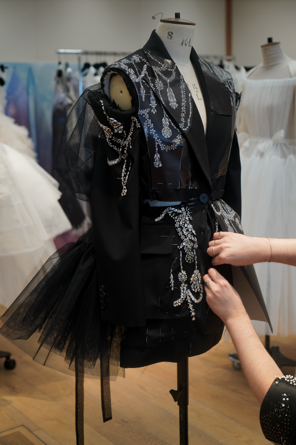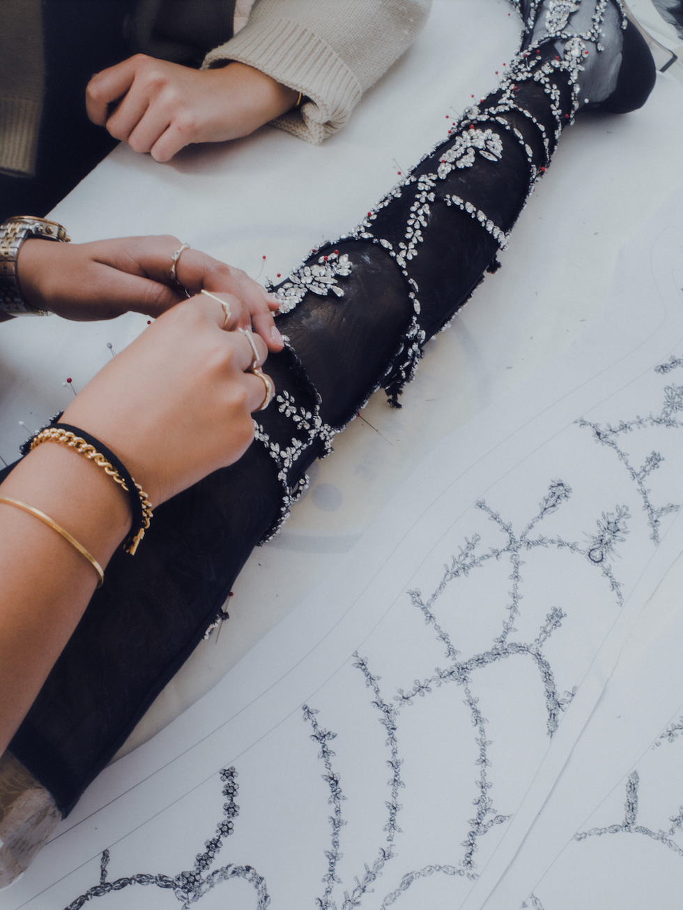 Entire panels of chandelier embroidery are fitted and placed on the final garments, and crystals are placed onto tulle cut by hand before being hand-embroidered on the final garment. For the black wool tuxedo jacket seen on Lady Gaga, crystal chandelier embroideries had to be hand-stitched onto satin lapels with a specific curve needle.