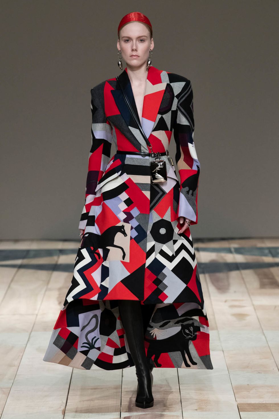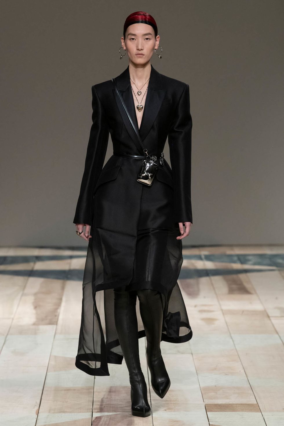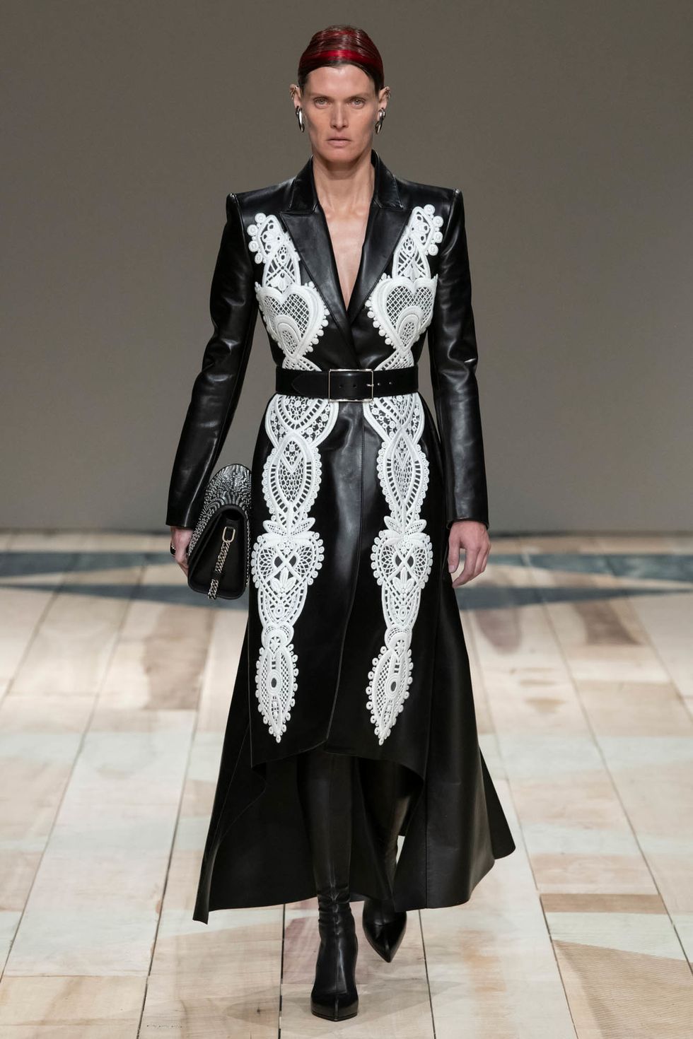 Even the metal clutches Burton designed were suspended from shiny leather harnesses, a look that feels irresistible over an understated yet sleek tailored suit. It's not all leather straps, however. Plenty of lighter touches like hearts, quilting and blankets evoked a sense of comfort and protection, where were inspired by Wales the region's crafty heritage.