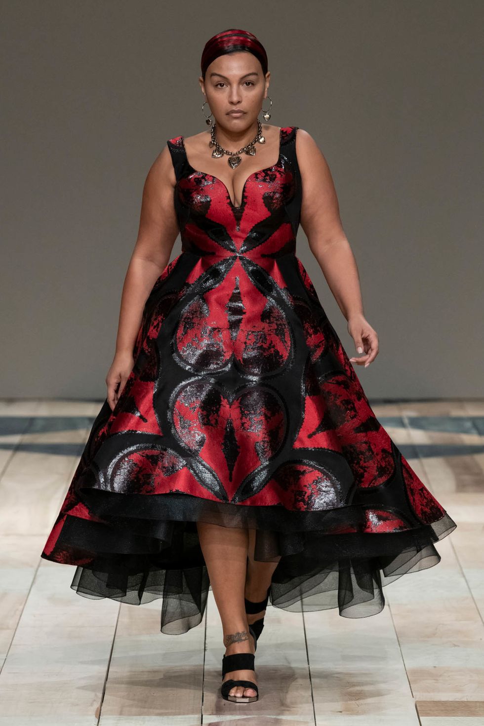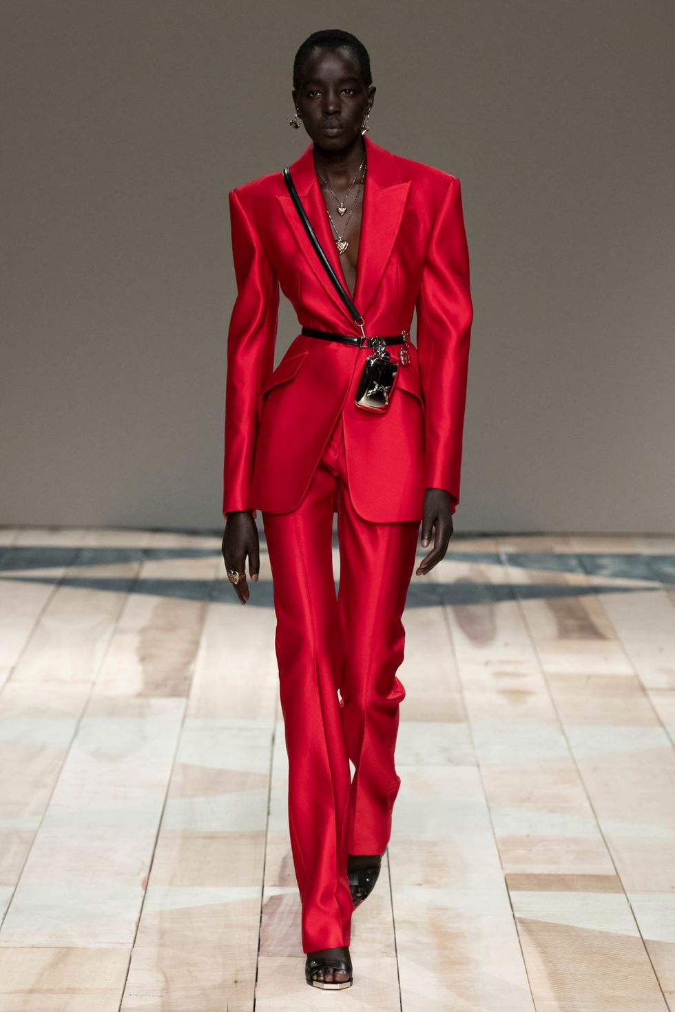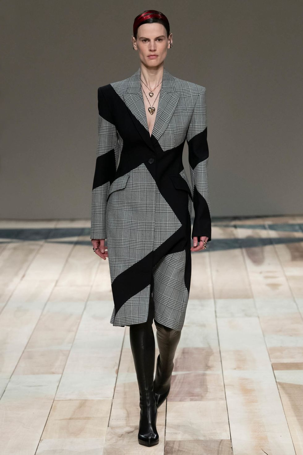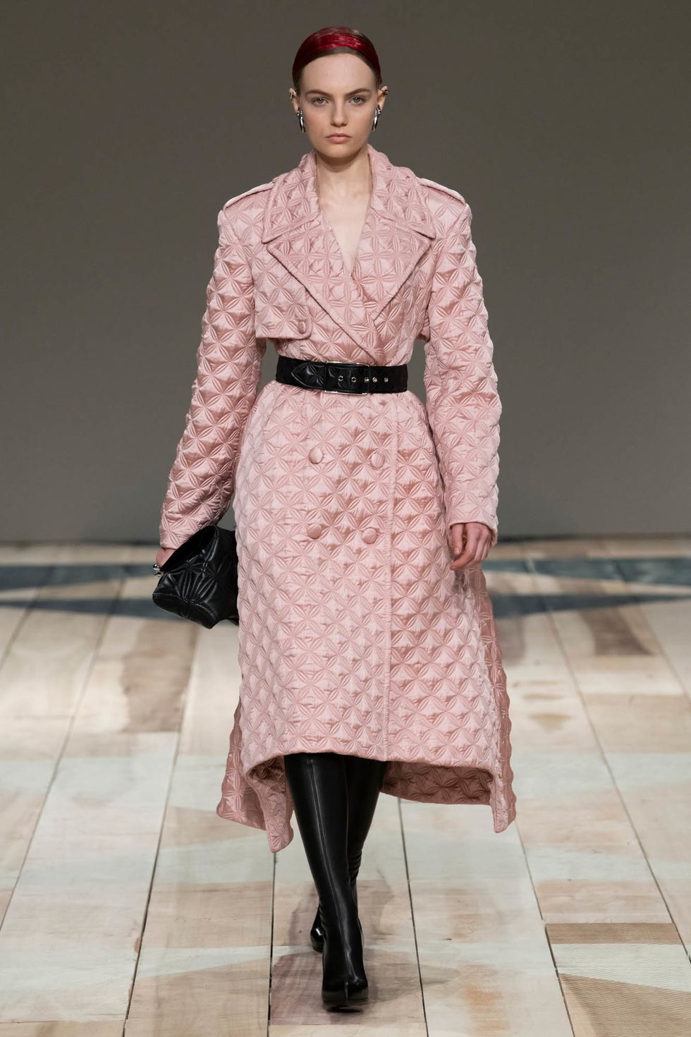 Even the metal clutches Burton designed were suspended from shiny leather harnesses, a look that feels irresistible over an understated yet sleek tailored suit. It's not all leather straps, however. Plenty of lighter touches like hearts, quilting and blankets evoked a sense of comfort and protection, where were inspired by Wales the region's crafty heritage.