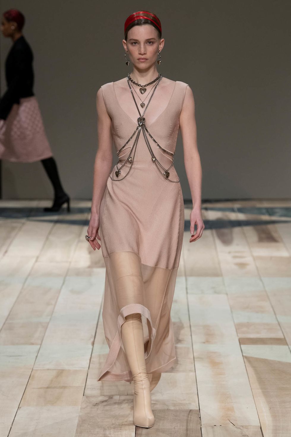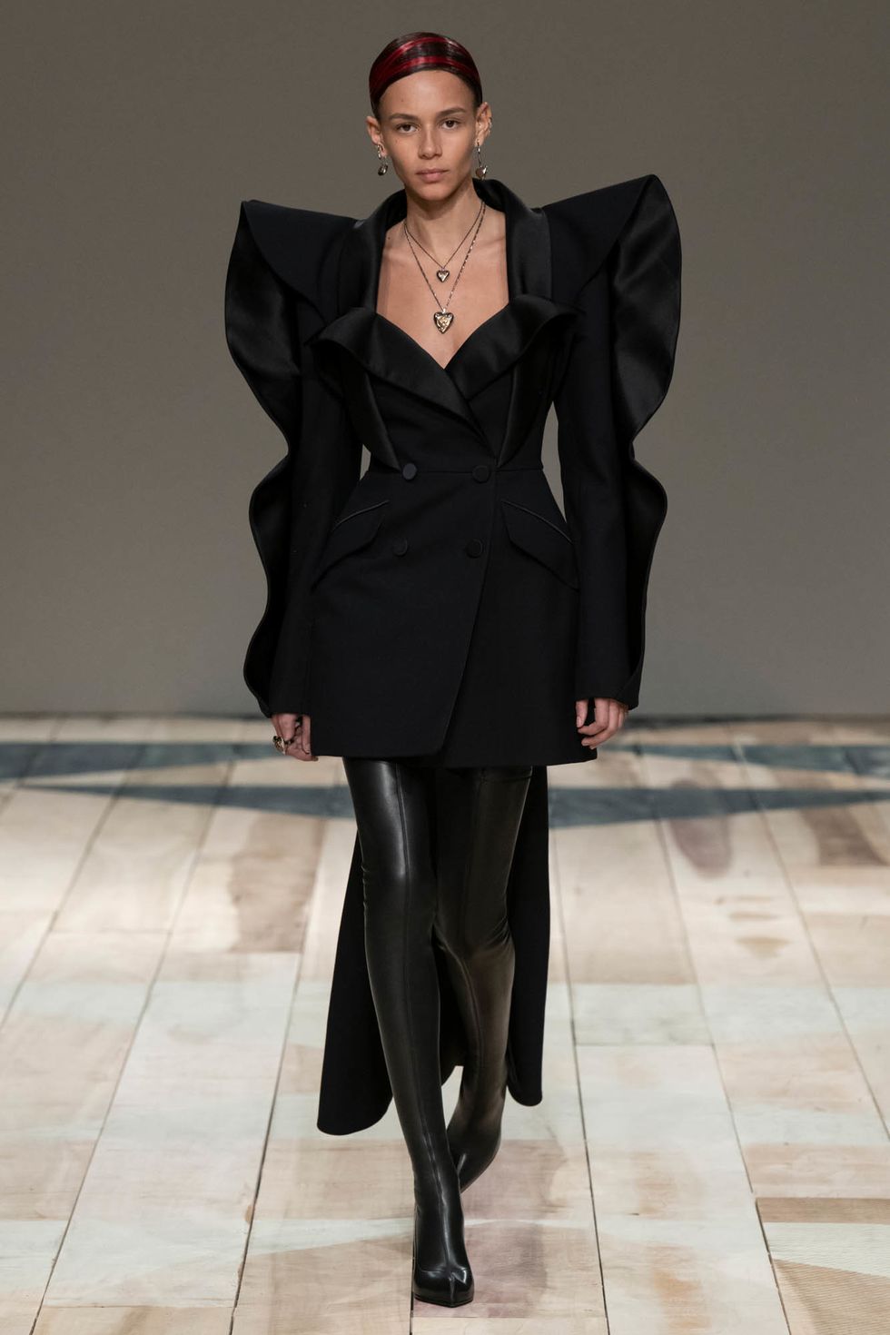 Harnesses, another one of her familiar tools, also made a return this season. Whether worn as a layer over a white poet-sleeved dress or draped under a lilac halterneck dress (in corset form), the look captures Burton's skill at combining soft, feminine flourishes with tough, severe elements.