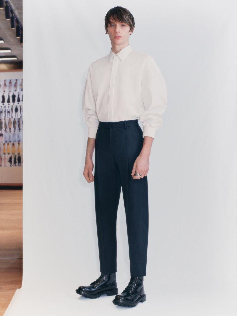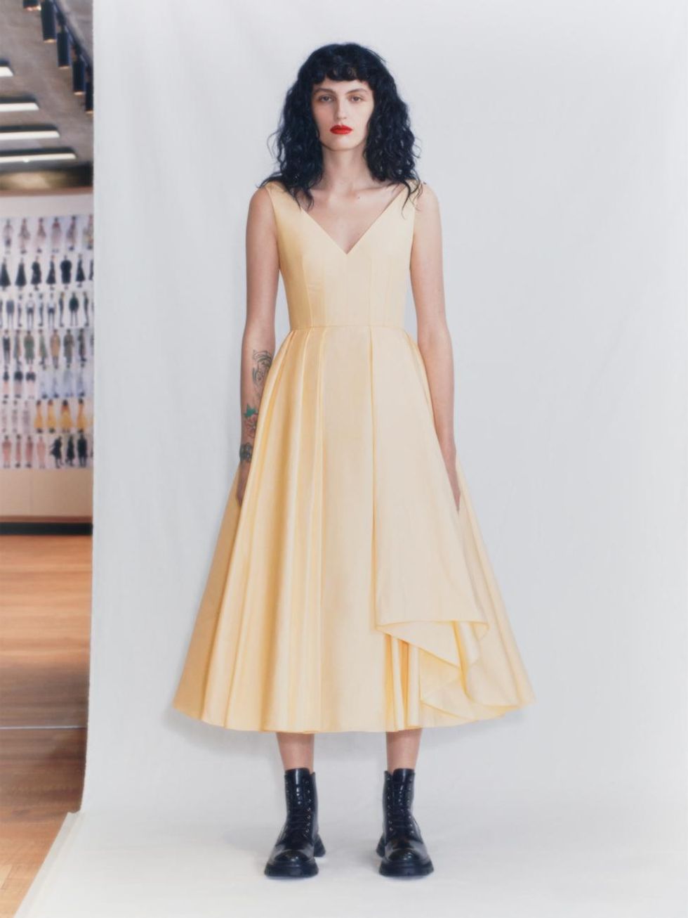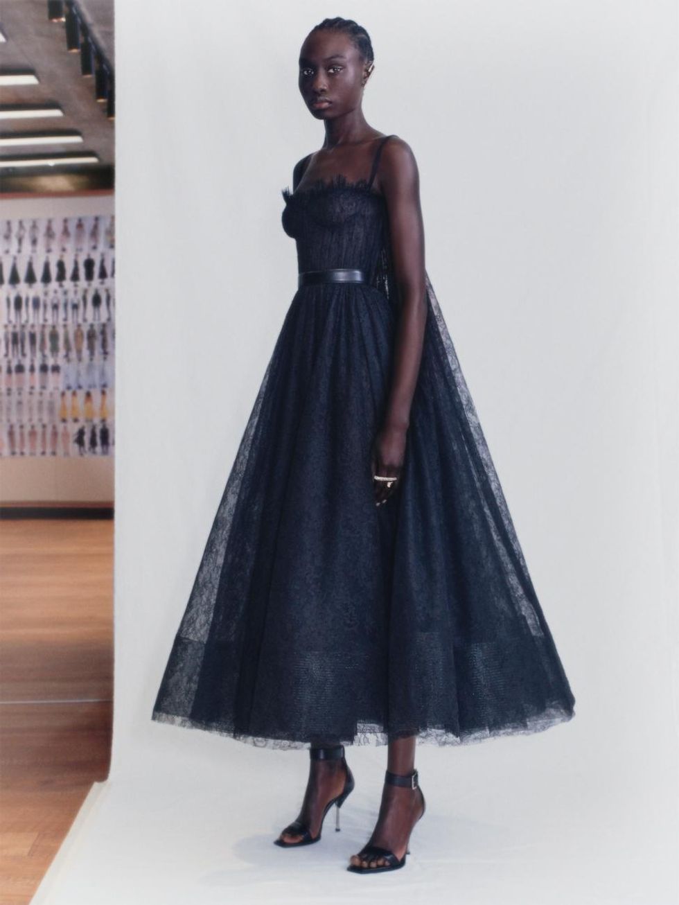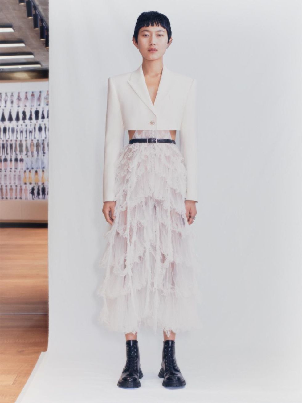 As for the collection, Burton had all but this to say in a statement: "Shape, silhouette and volume, the beauty of the bare bones of clothing stripped back to its essence — a world charged with emotion and human connection." This manifested in giant shoulders/ sleeves, dramatic tulle skirts and pared back corset detailing.