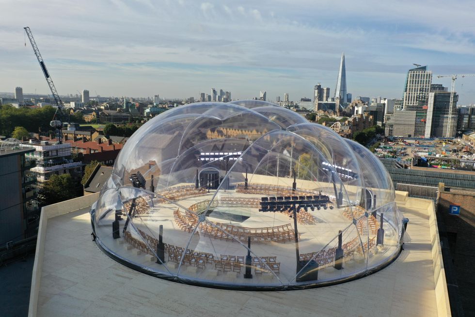 The brand, which usually shows at Paris Fashion Week (which just wrapped up last week), set up a giant transparent bubble dome on the rooftop of a 10-story warehouse in East London, which would have been perfect in case of rainy weather but, alas, the skies were clear as day.
