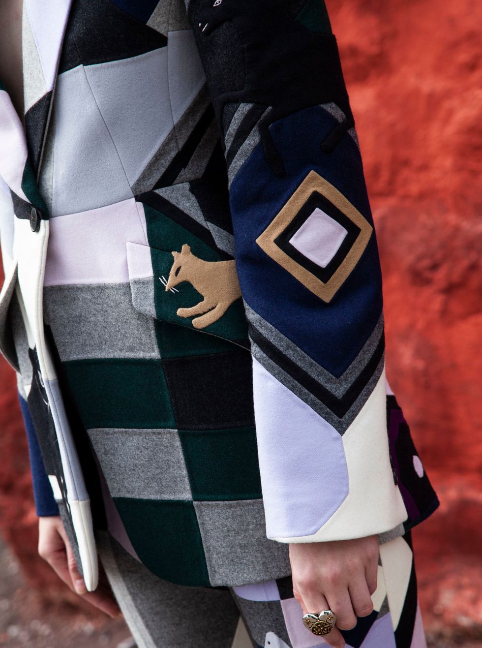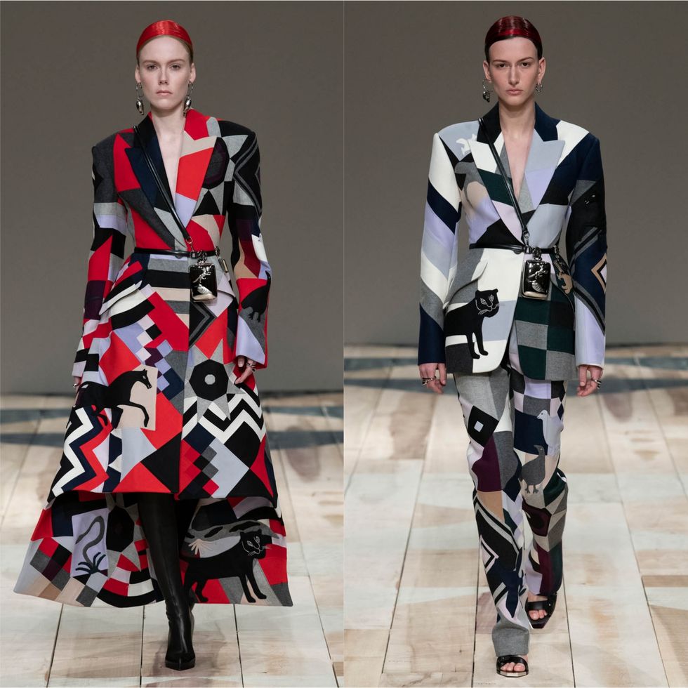 Two looks in particular from that Fall 2020 collection — a patchwork suit and tailored coat — were notable for their graphic patchwork prints and animal motifs. They were both inspired by the Wrexham Tailor's Quilt, a mid-19th century artifact that caught Burton's eye during a visit to St Fagan's National Museum in Cardiff.