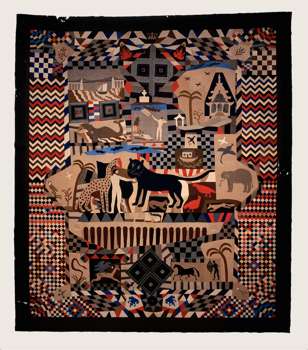 The quilt, which took ten years to assemble, is made up of over 4,500 scraps of recycled cloth by James Williams, a military master tailor. A variety of biblical scenes historical references are incorporated throughout, from Noah's Ark to Jonah and the Whale.