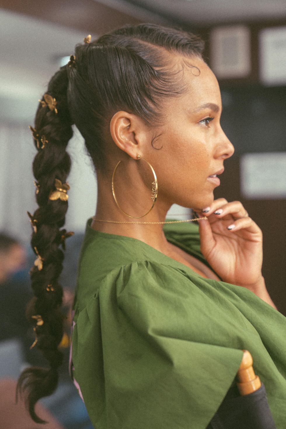 Every major live performance calls for a full glam overhaul, and Keys' team set her up for success, with hair by Nai'Vasha Grace and makeup by Tasha Brown. She wore her hair pulled back in a long chunky braid, decorated with golden butterflies to match her dress and natural glowing makeup that relied heavily on proper skin preparation for Keys to feel "completely herself."