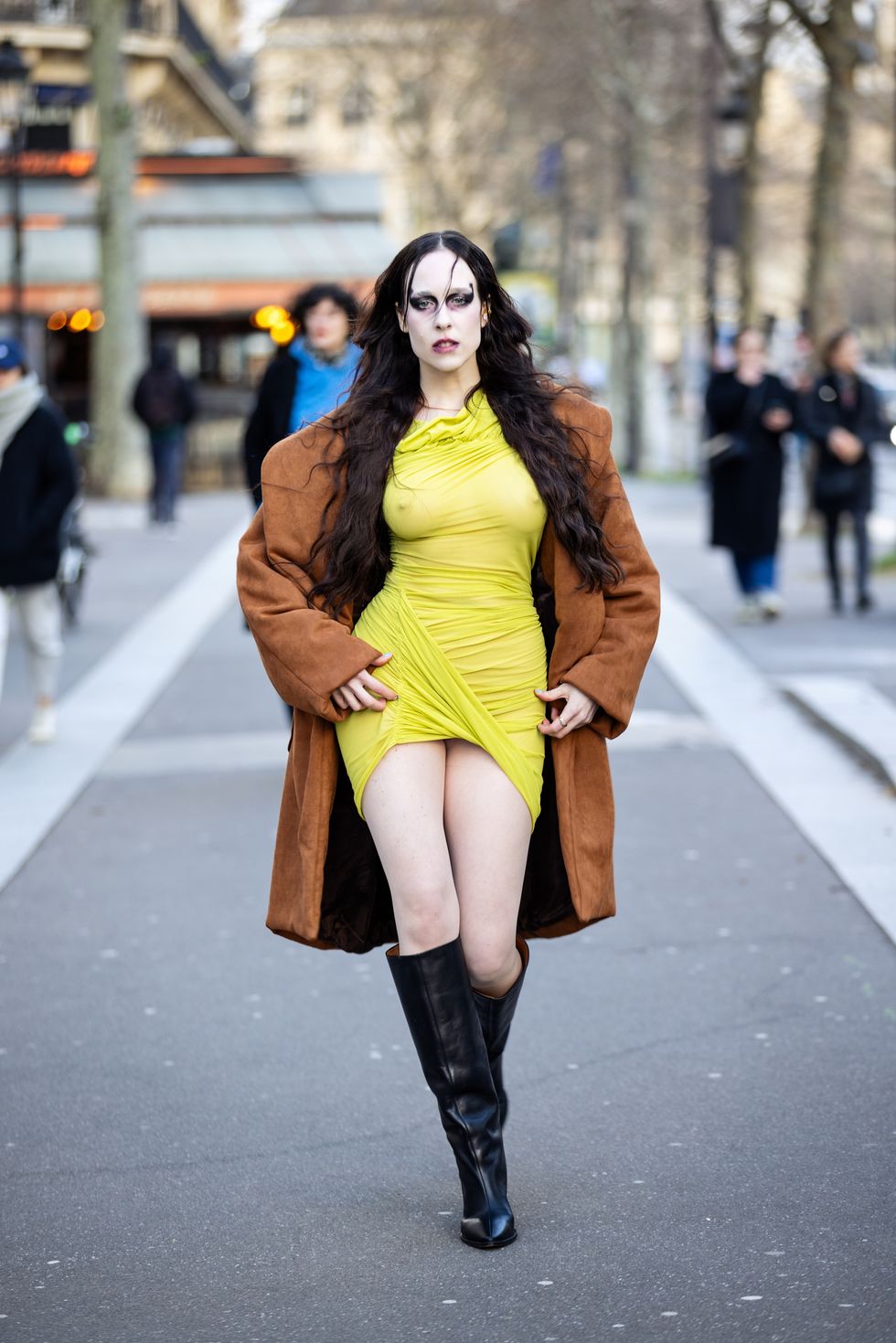 The Look: A neon yellow, sheer party dress that cinches closely around Allie X’s figure — styled with a puffy camel overcoat and knee-high leather boots. The outfit lays and gathers in a way that almost appears wet, with eerie glam like she’s just stepped out of a frozen ice bath.