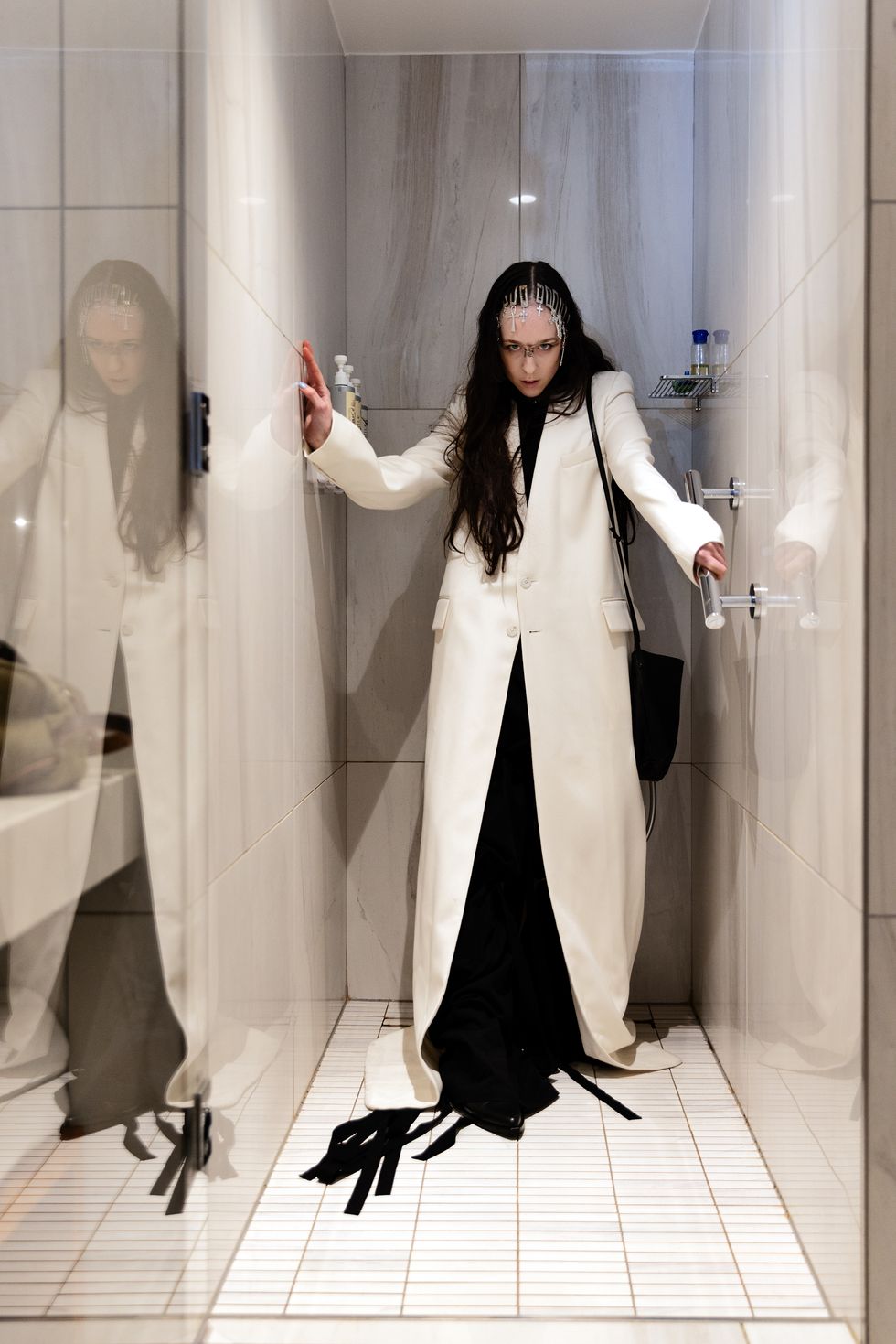 The Look: A long, cream-colored top coat that pools at the floor with extended sleeves to match. Hair clips and cross-shaped charms frame Allie X’s face, as black eyeliner is sketched haphazardly around her bare eyes in an almost feral, childlike way.