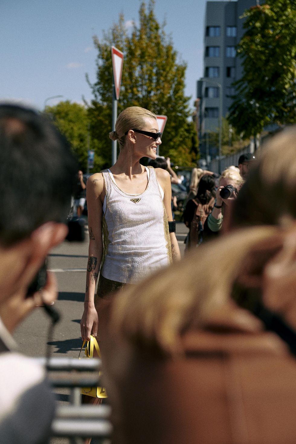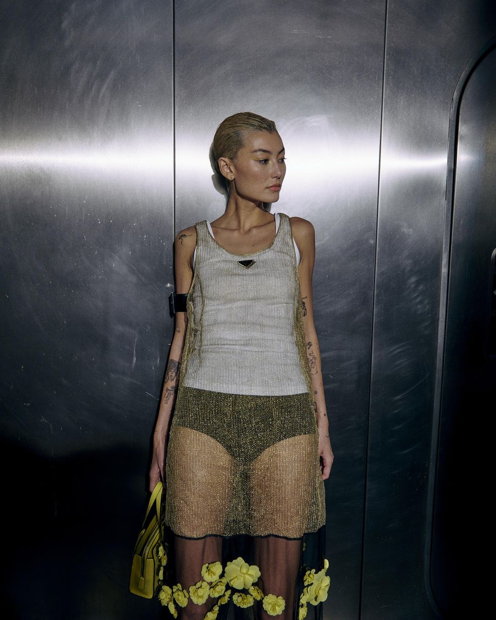 Amalie Gassmann is always a front row staple on the Fashion Week circuit, where she hits up the most exclusive shows and parties from New York to Paris. In Milan, the writer and filmmaker attended the Prada show in one of the brand's signature looks from last season: the tank dress with sheer overlay and floral skirt.