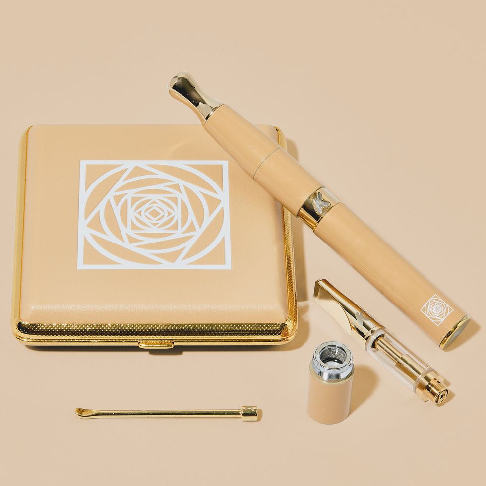 "I want it to feel like a celebration when they inhale," says Amber. Her pens are the first to use an all-quartz bucket and coil, which means a smoother steamy feel rather than a rough burning sensation when you smoke. Each one is handmade, and comes with a gold-trimmed, champagne-colored leather case.