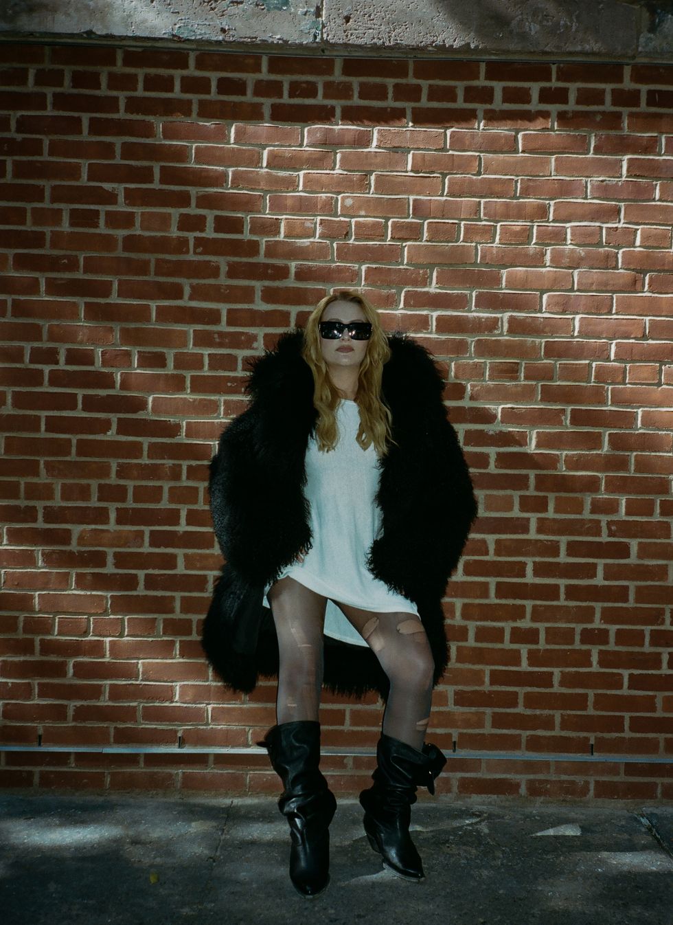 Coat: Michael Kors Collection, Shirt and boots: R13, Tights: Falke, Glasses: Boss