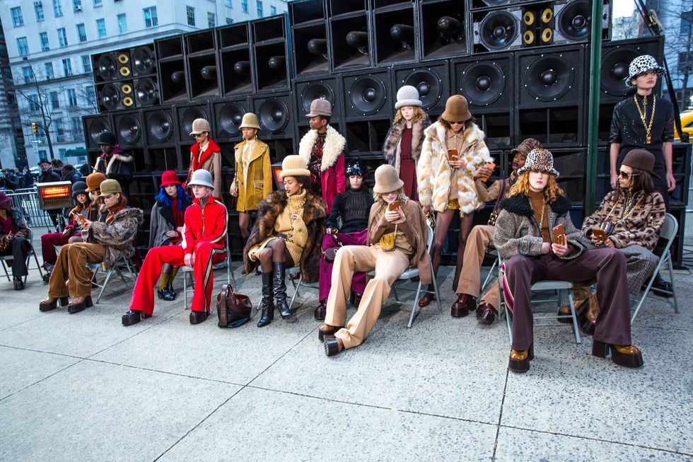 In a moving end to the week on Thursday, Marc Jacobs showed his fall collection, a luxe homage to '70s and '80s hip-hip and b-boy street wear, in a bright and bare Park Ave Armory where show-goers sat directly facing each other on utilitarian folding chairs in relative silence. The models spilled out onto Park Ave and took their own seats and in an elegant twist, were sat waiting, iphones at the ready, to film the editors and celebrities (Katy Perry, Li'l Kim, Emily Ratajkowski among them) as they filed out of the Armory, thinking that was the end of the show. Respect was what Jacobs stressed in his show notes; respect for the legacy of black culture and fashion from the period, noting he was heavily influenced by the documentary Hip-Hop Evolution. The clothes were exceptional and the execution of the show was nothing short of poetic.