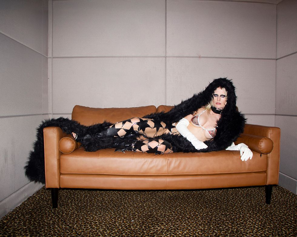 Jacket: Eleen Halvorsen, Bra and bracelets: Mel Diosa, Panties: Zana Bayne, Shoes: Jeffrey Campbell, Tights: Stylist's own