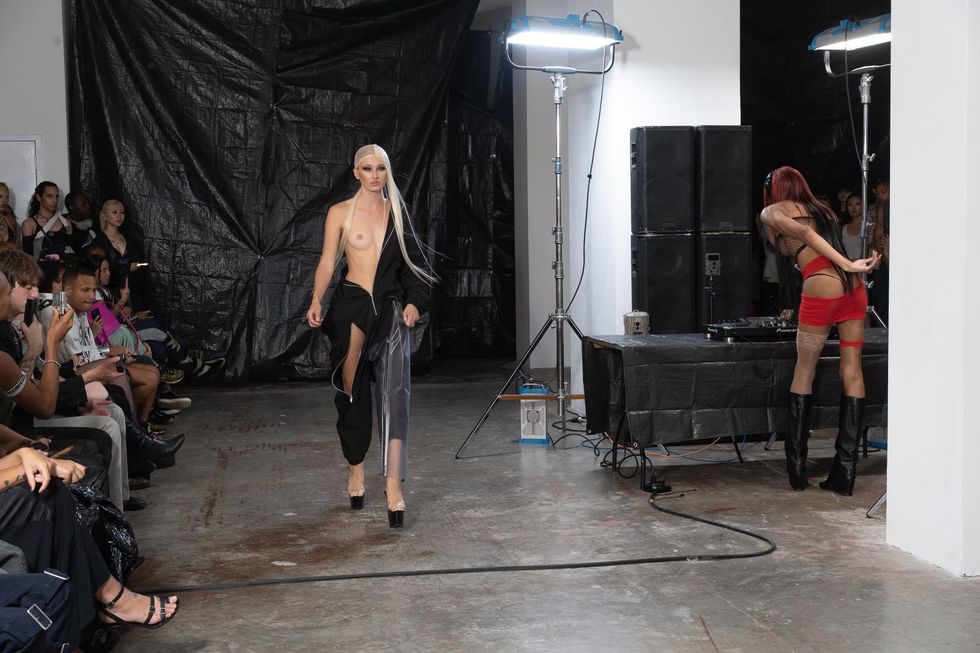 “Uh huh, this my shit/ All the girls stomp your feet like this.” Gwen Stefani’s voice repeats the iconic early aughts lyric in a hardcore “Hollaback Girl” remix. Chicago-based HIM HUN is warming up the audience at Anna Bolina’s off-calendar presentation, rattling the windows with her DJ set in a fishnet dress that emphasizes her thong underneath. For this particular crowd, it’s a familiar sight and volume — the type of room you’d find in any 3 AM warehouse, only with the lights on and a little more space to breathe.