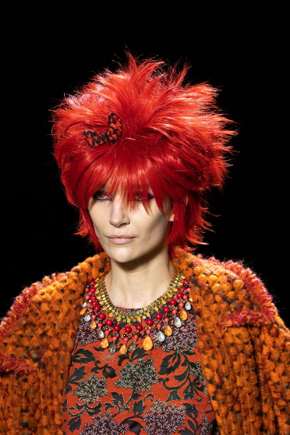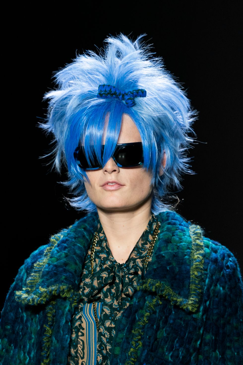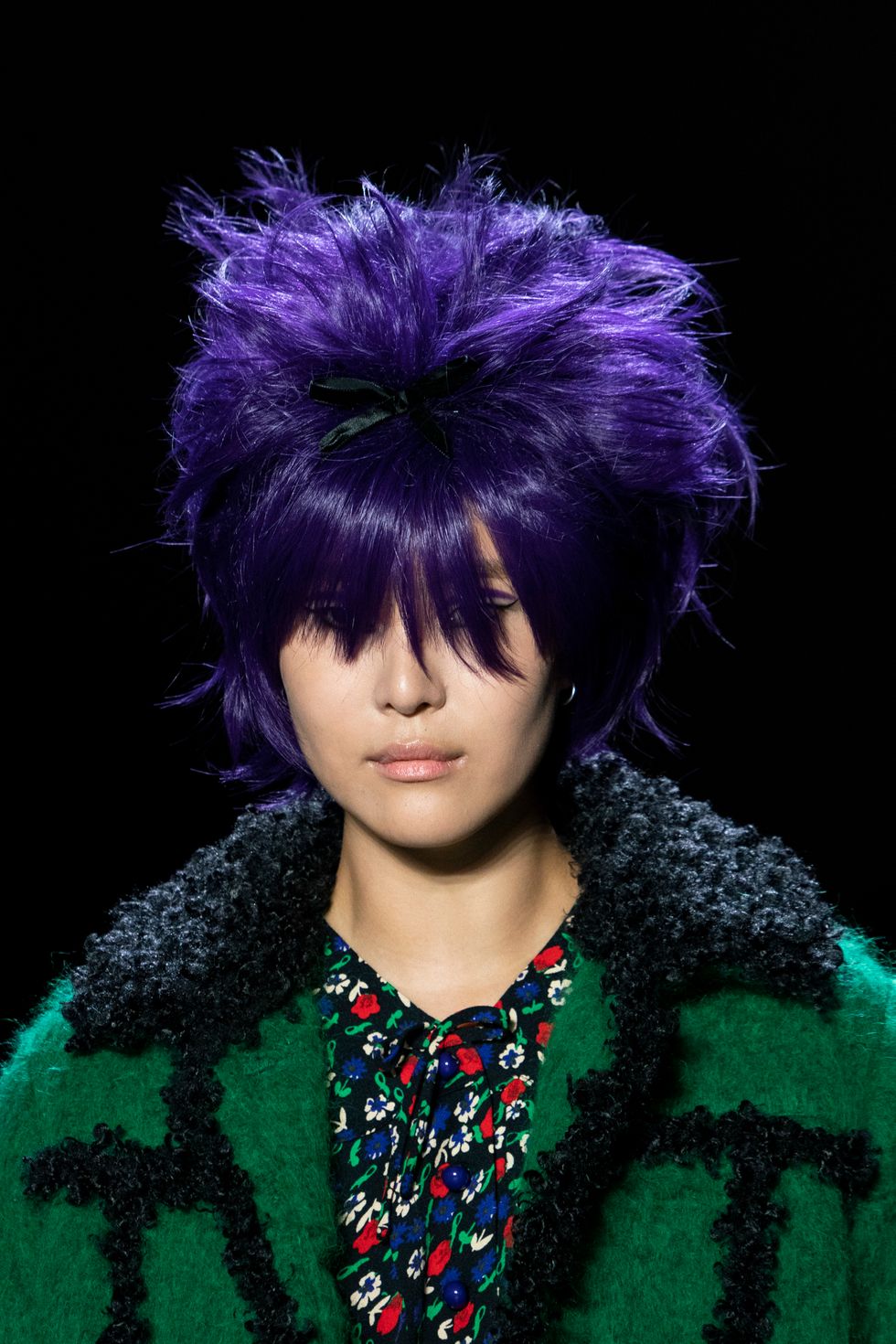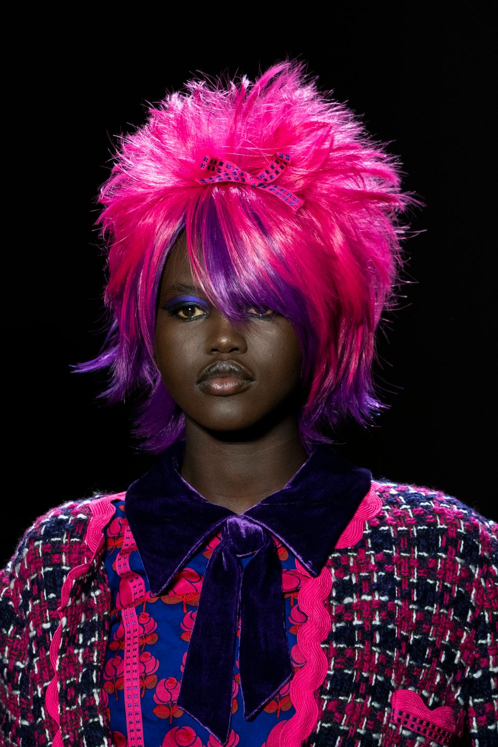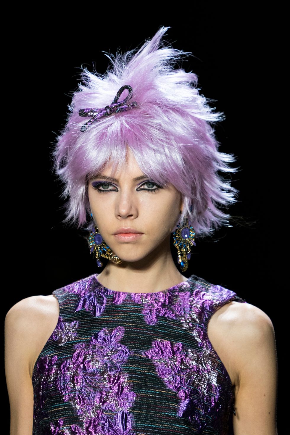 If taking advice from Sui this season, one sage point is to match your hair to your outfit. Models wore wigs in shades or turquoise, lilac, fiery red and periwinkle — with outfits that matched tonally.