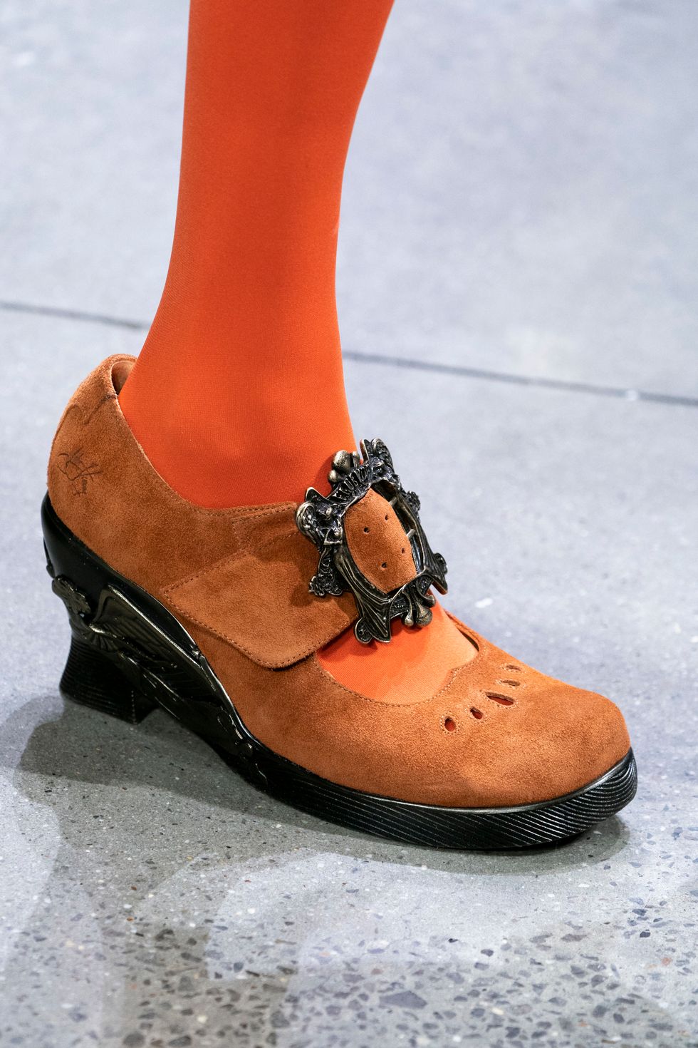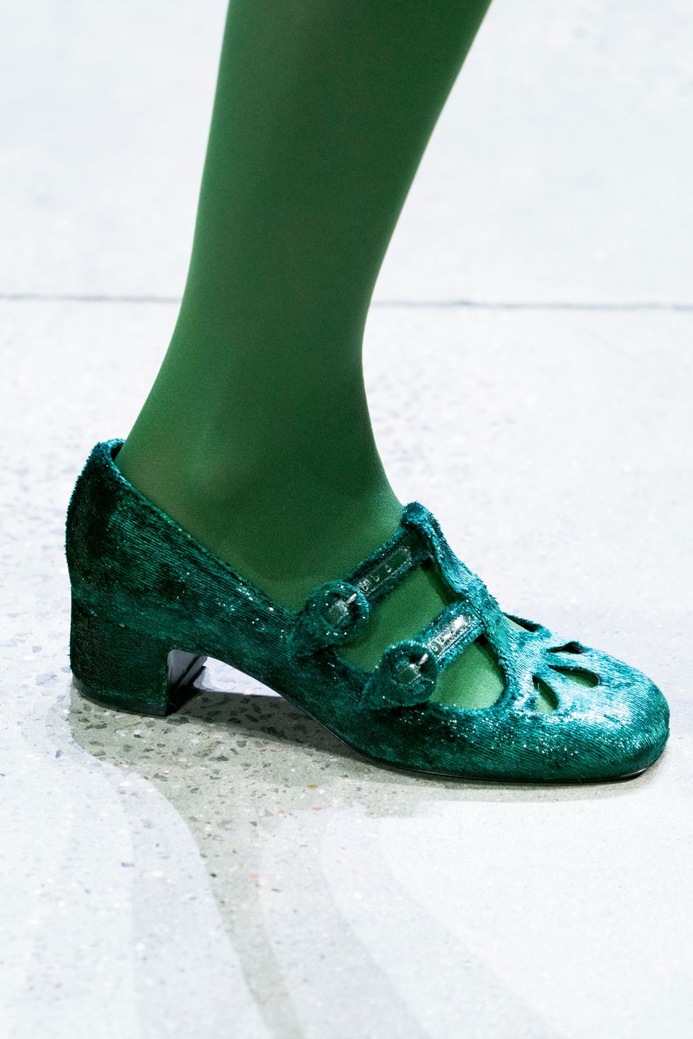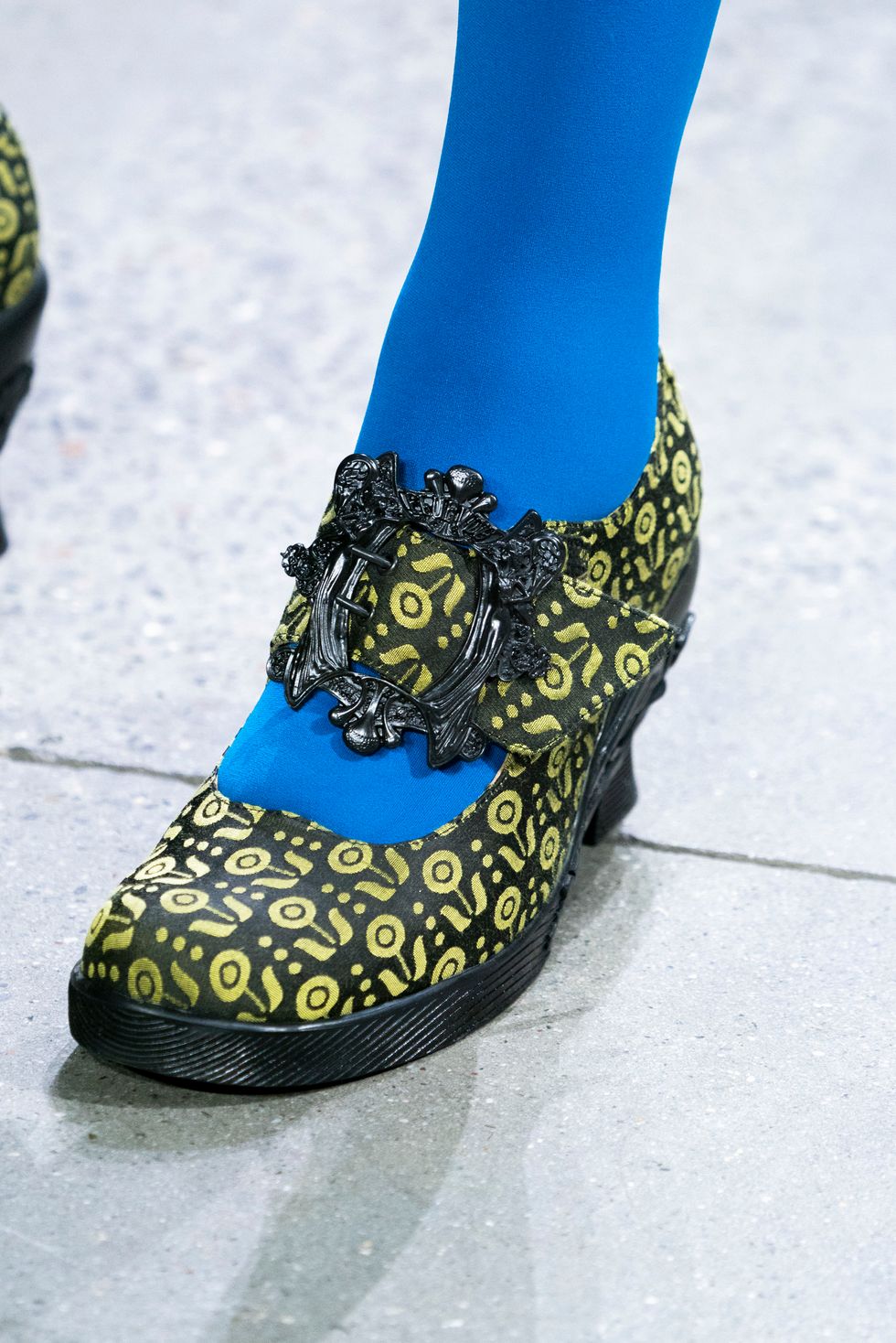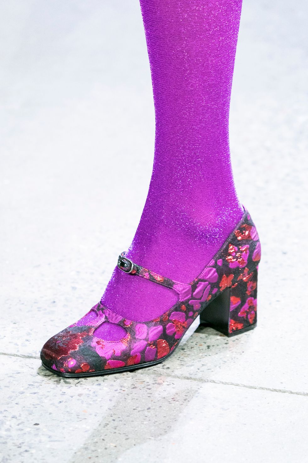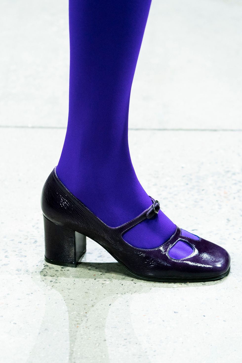 As if that weren't enough, nearly every look was styled with a pair or brightly hued tights in solid shades of violet or cobalt, for example. This gave the collection an overall vintage vibe.