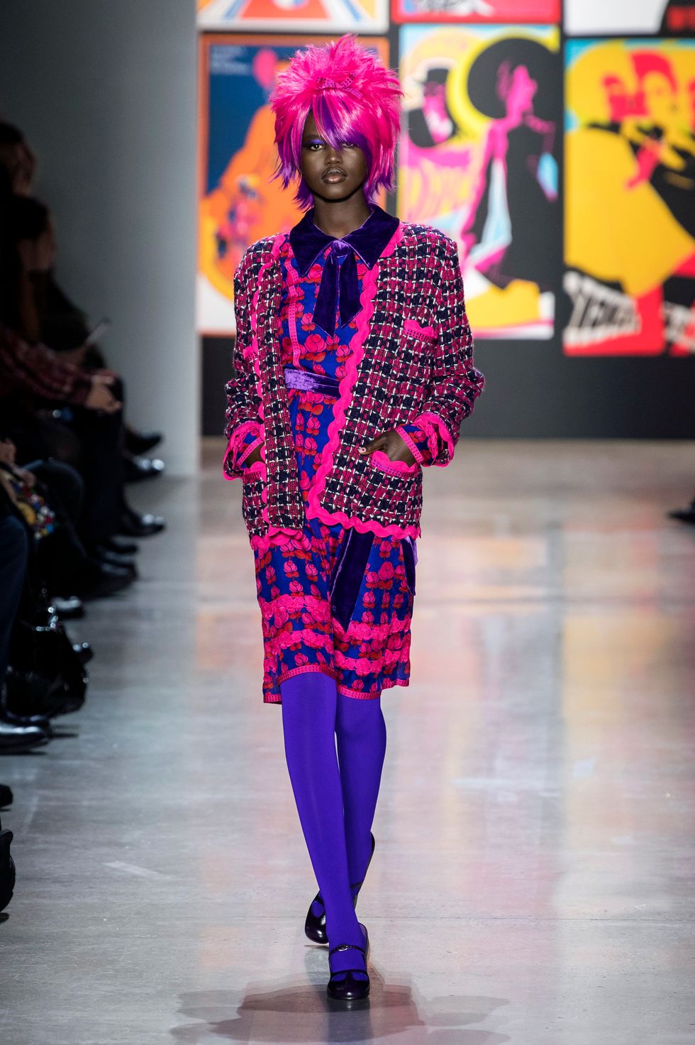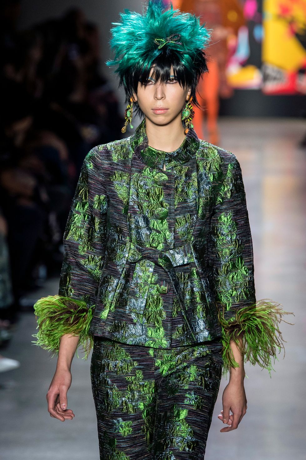 Marabou feather trim — a popular trend for fall 2019 — strikes again! In the hands of Anna Sui, colorful feather trim was applied to a gorgeous brocade suit.
