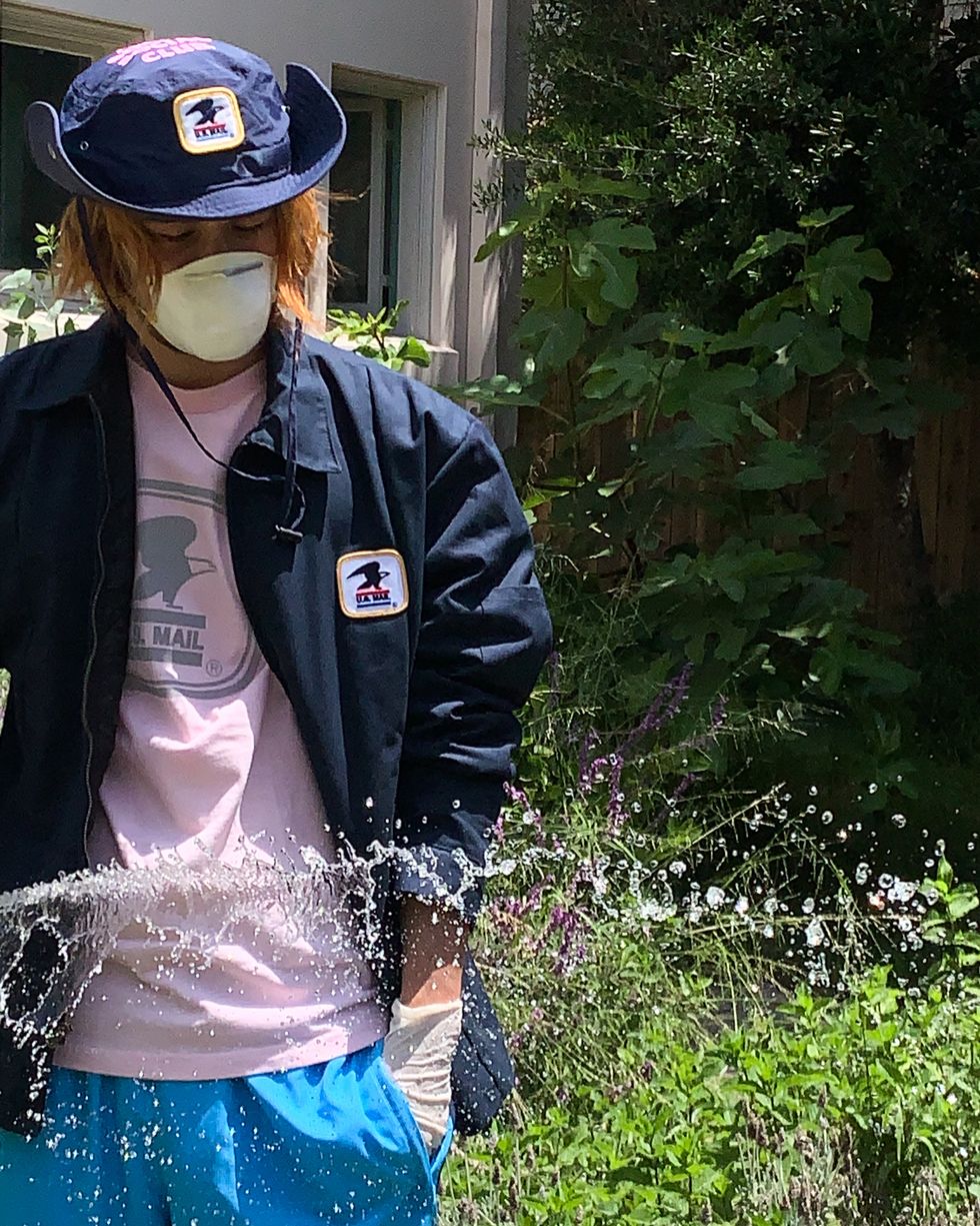 The collection features a snap sun hat, short sleeve button-up, work jacket, tees, classic cap and hoodie with a playful pink line and 3M reflective tape. Each piece mimics the classic uniforms of the essential federal workers, featuring the signature wavy ASSC logo alongside the iconic USPS badge.