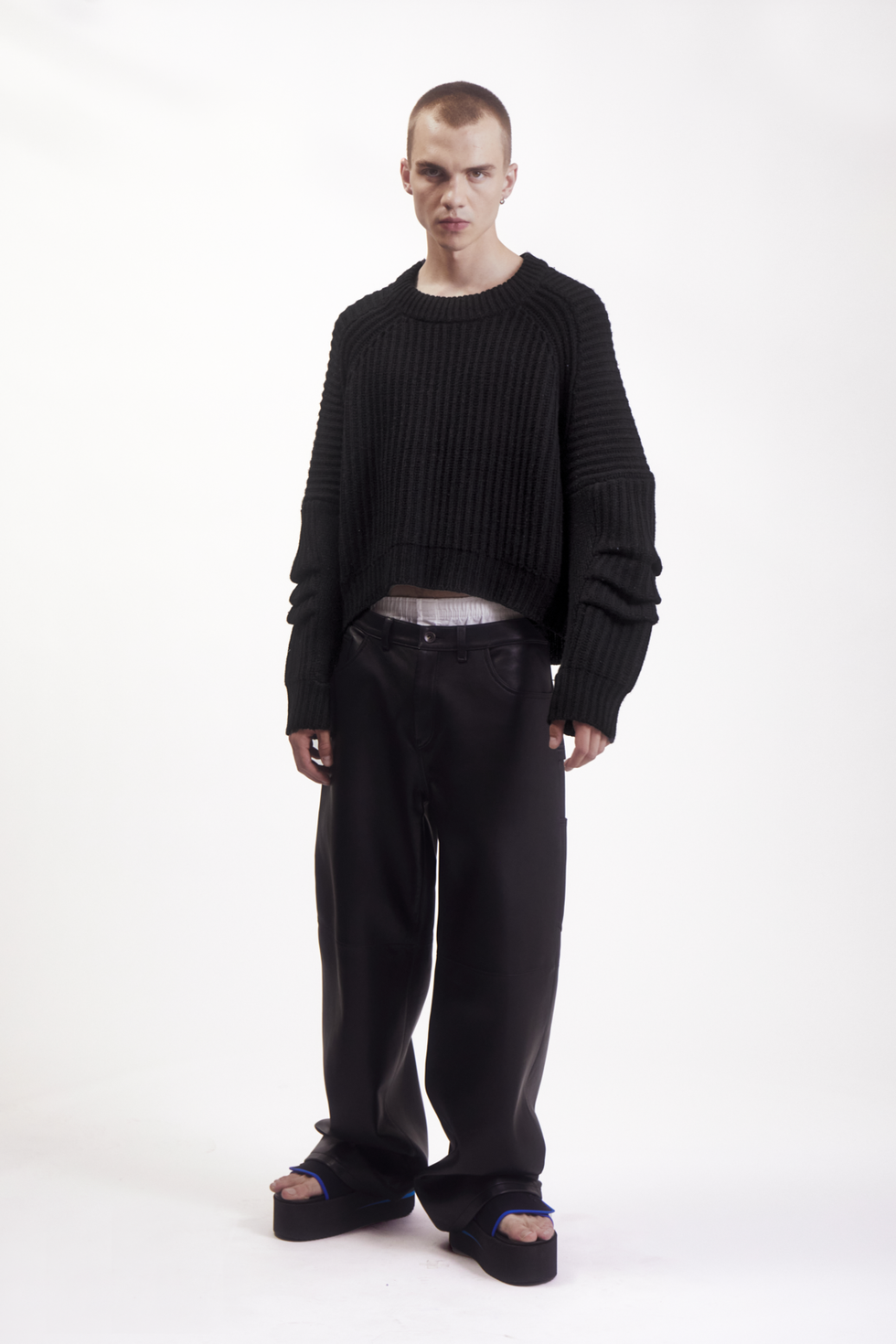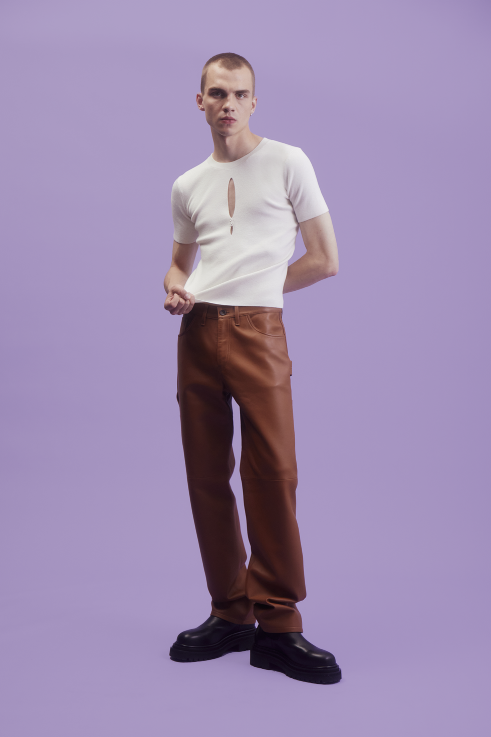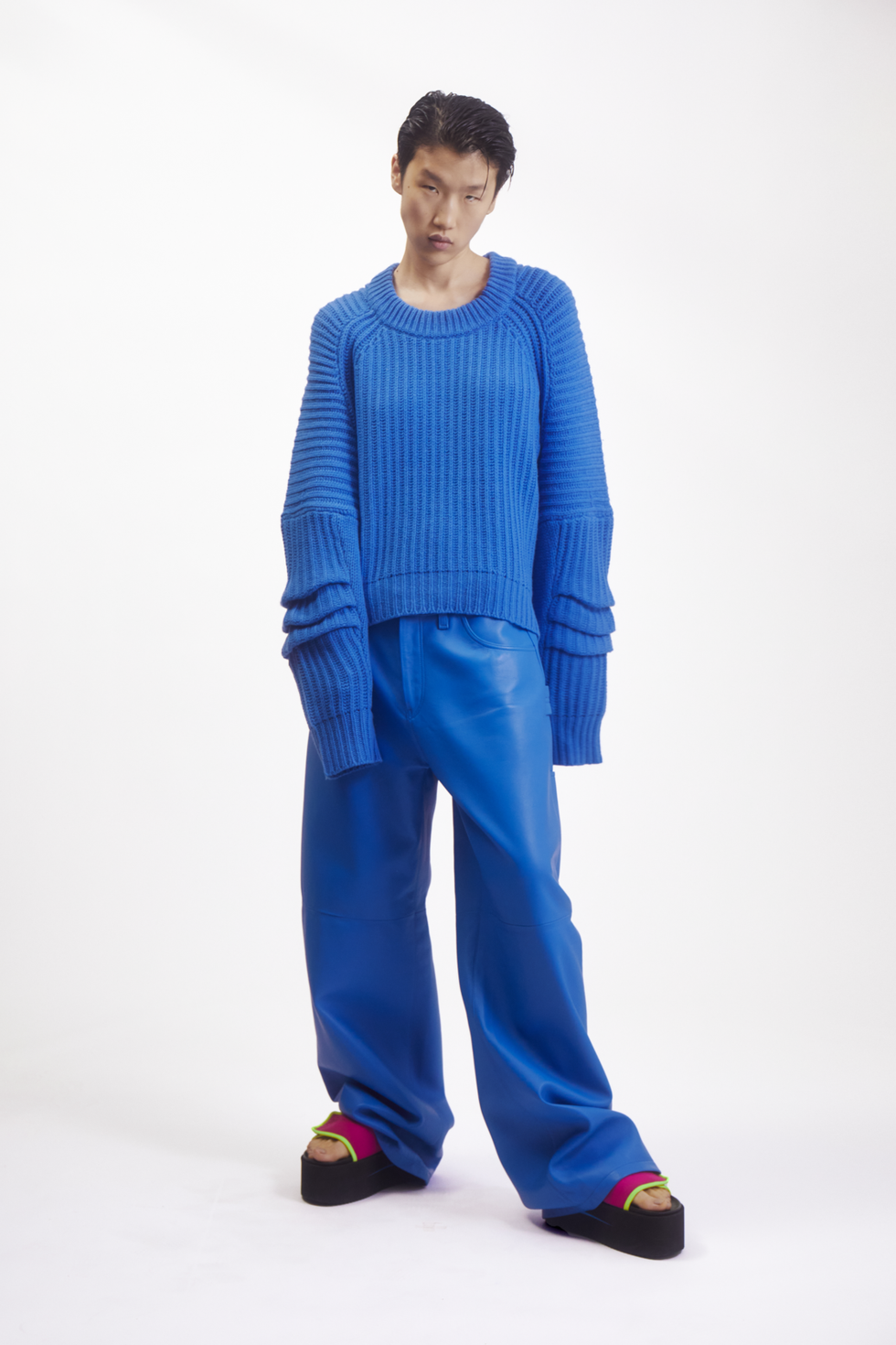 The third installment of ALTU blends late nineties and early aughts teenage style with a fluid approach to identity, sexuality, and presentation. It features exaggerated proportions, neon colors, and playfully subversive detailing. Knitwear has delicate cutouts with tiny ring piercings at the collar and hem. Cargo pants reference varsity athletic wear with cinched hems and zip sides. A cropped motorcycle jacket and leather biker pants with denim crotch detailing are introduced for the first time.