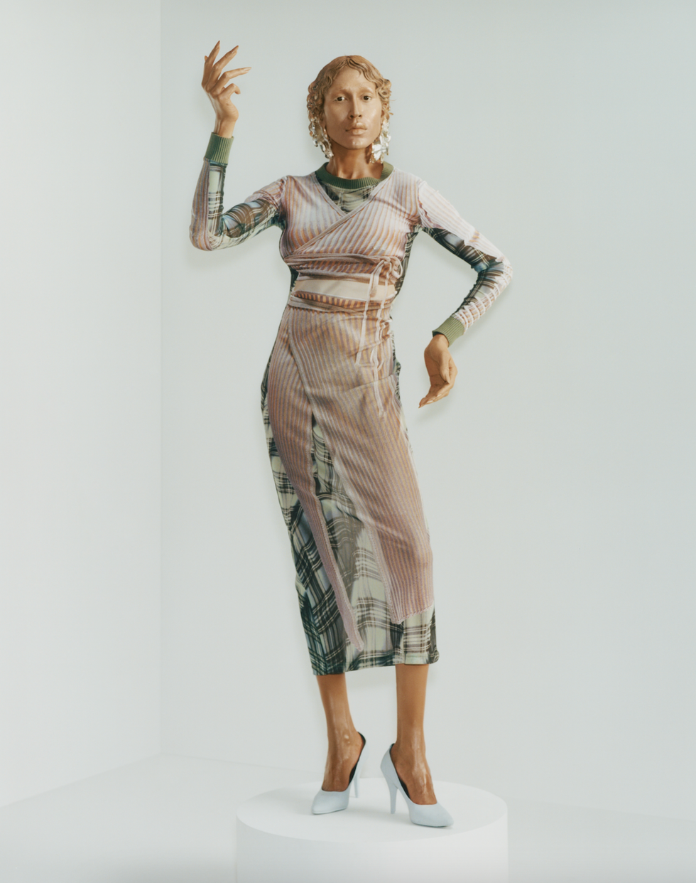 Glenn Martens first introduced his Jean Paul Gaultier capsule at his Fall 2022 show for Y/Project (he would later design a couture collection for the brand) which featured Gaultier's signature Trompe l’œil prints. The two brands are reuniting for a second capsule collection featuring more of the 2D illusion knits on mesh dresses, tank tops, turtlenecks and skirts.