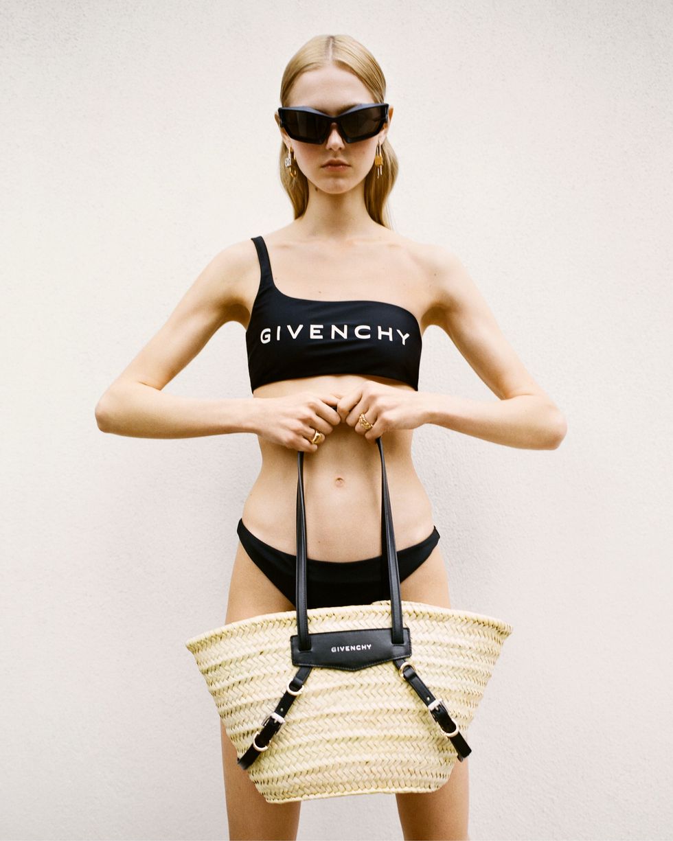For Pre-Fall 2023, Givenchy debuts Givenchy Plage, a “city to sand” swim- and beachwear capsule of ready-to-wear and accessories inspired by Hubert de Givenchy's seaside estate in Saint Jean Cap Ferrat. The collection revisits House signatures and presents seasonal variations on accessories, from a "straw basket" version of Givenchy's new Voyou bag to Marshmallow wedges and classic G-Tote shoppers.