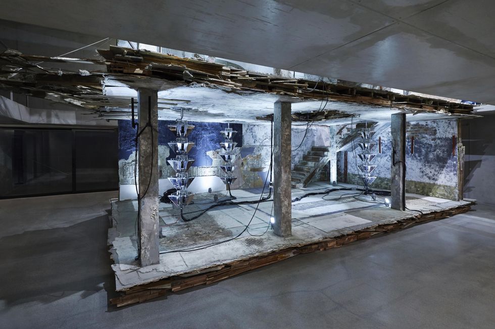 This time, the newly launched HAUS DOSAN 0 10 10 10 features a two-story installation by Frederik Heyman accompanied by an original soundtrack from Arca. Echoing the post-apocalyptic cyberpunk landscapes that dominate the artist's digital work (like his PAPER Lady Gaga cover), the massive concrete structure greets guest on the first of five levels and resembles an excised section of an abandoned warehouse, punctured by chrome spires and lengths of wire and tubing.