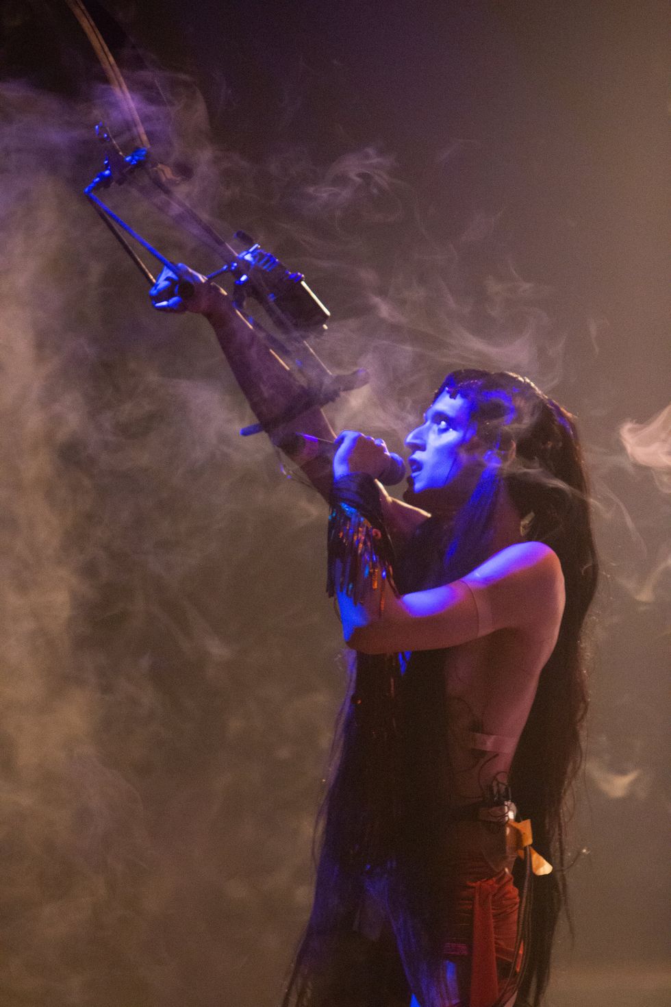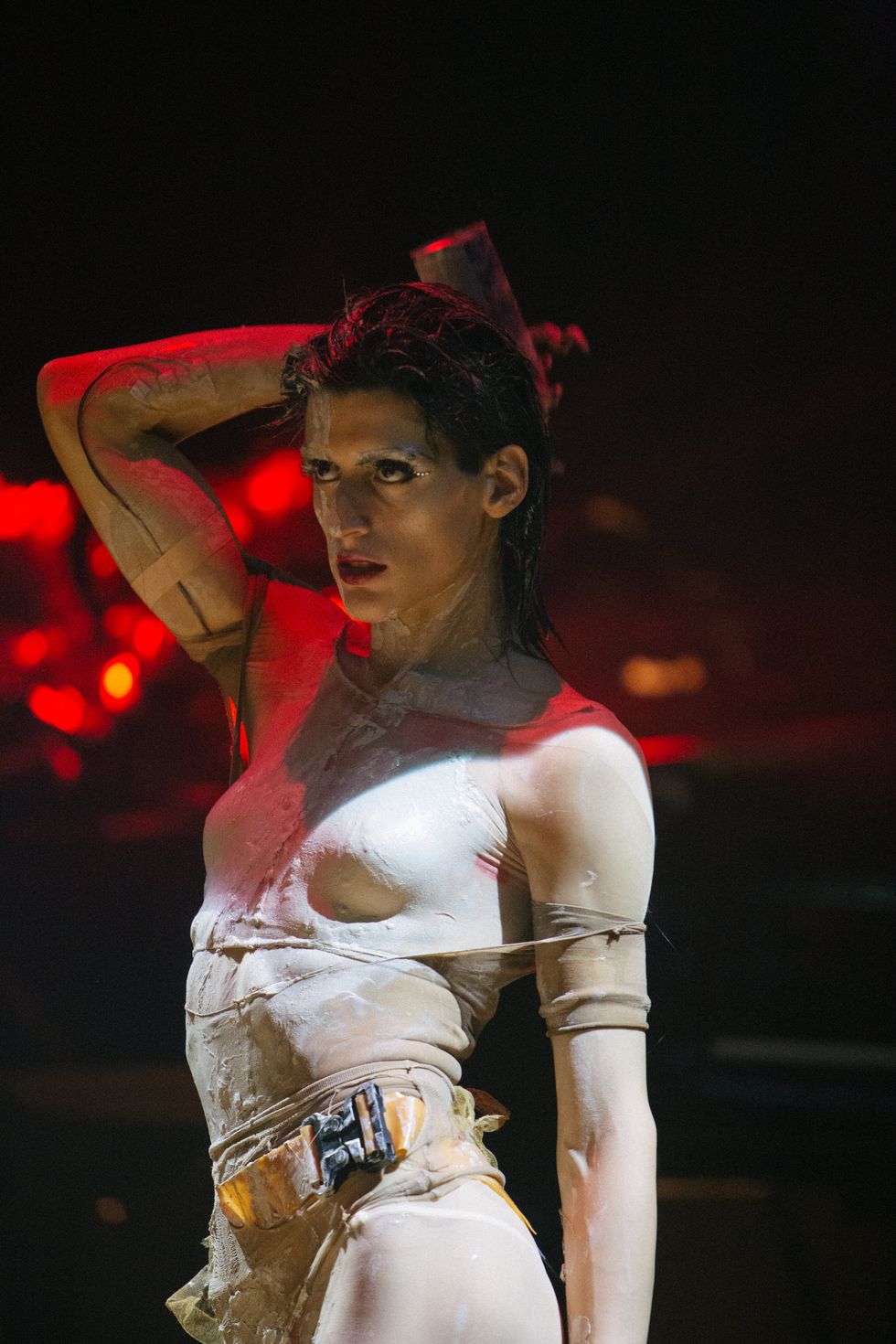 Divided into roughly five interconnected sections on stage, the first night, "Gestation," saw Arca introduce the various tools at her disposal, many of which were customized specifically for Mutant;Faith. There was a 9-foot stripper pole that could be danced on and played like a synthesizer, a baby grand piano hooked up so that it could be looped on the fly, a set of acrobatics rings rigged in a similar manner as the pole, a mechanical bull decorated with bows and hair extensions, a station for Arca to produce songs in real time using Ableton, and a dirt-covered stage at the center of it all.