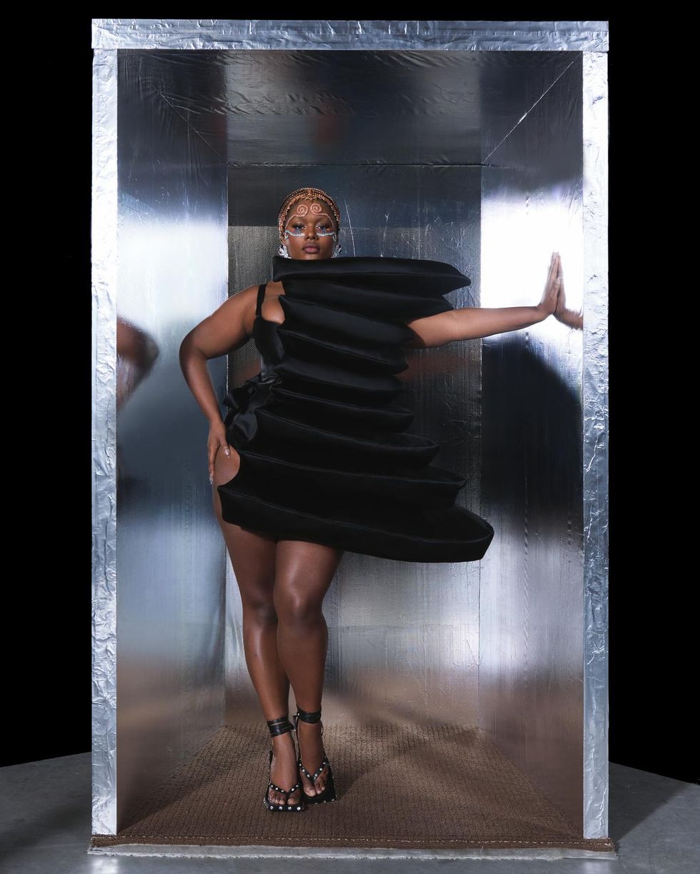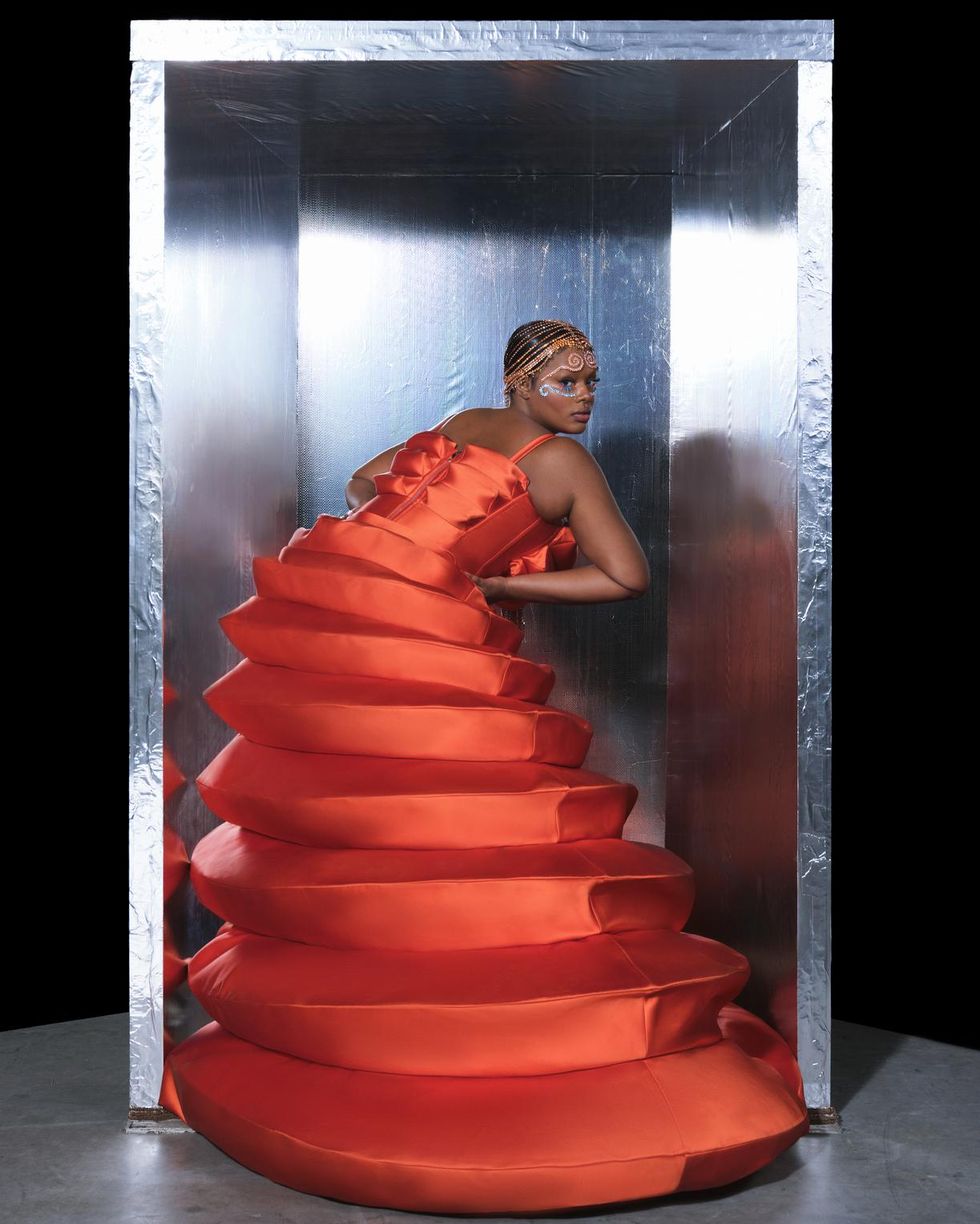 To that end, the duo enlisted Yasmin Wijnaldum and plus-size beauty/model of the moment Precious Lee to show off the couture wares, which included a cake-tiered confection, tuxedos embellished with extravagant metalwork and pannier dresses with a chandelier of crystal fringe.