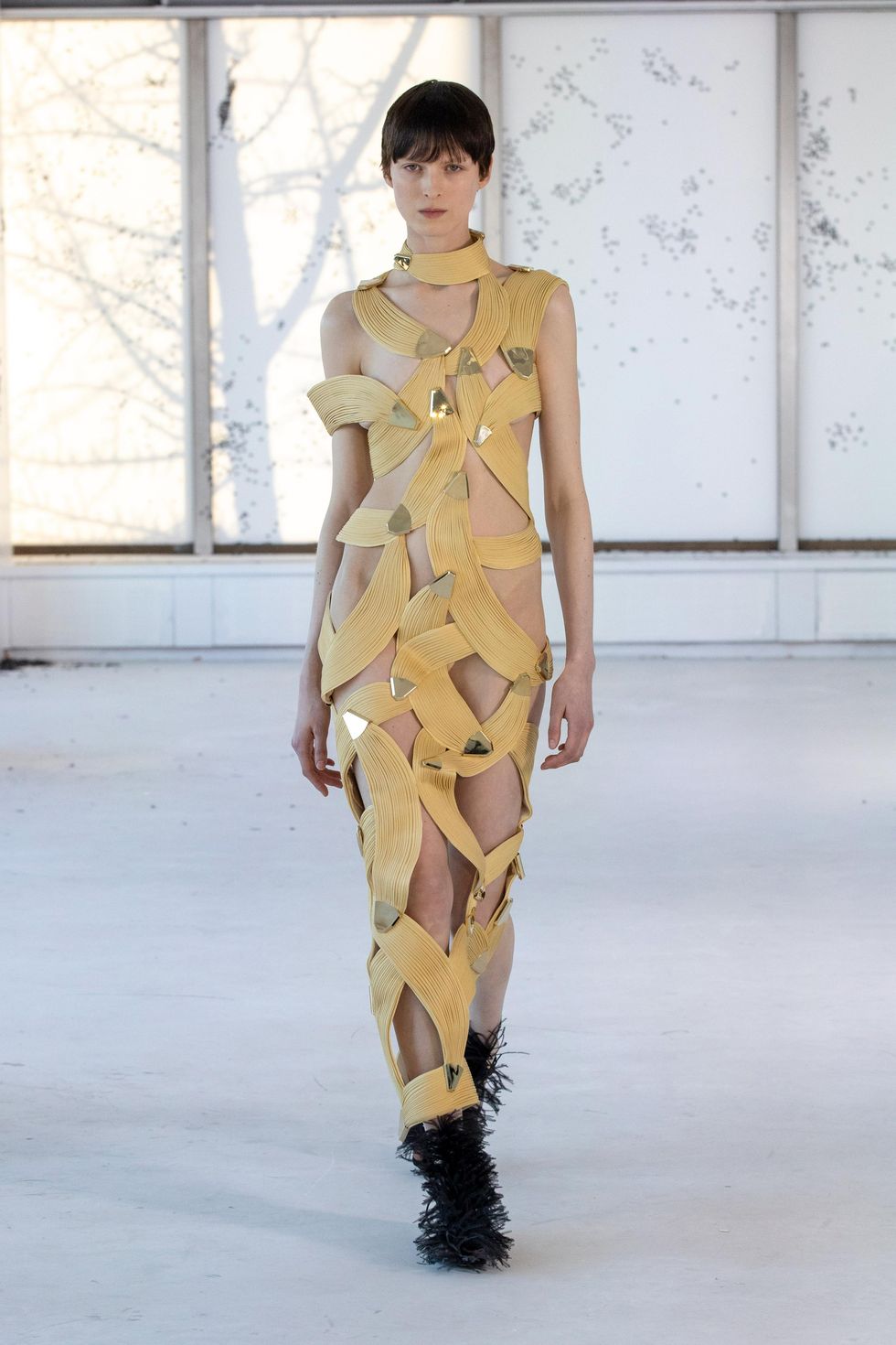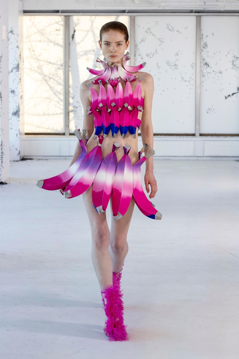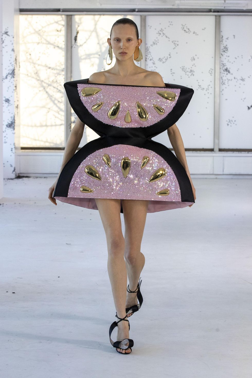Other looks included couture watermelon dresses cut into slices, silk jersey pleated into flat banana panels and connected by gold faceted caps, plunging halter dresses made from yellow crystal banana beading with decaying brown spots and crystal grape vine collars.