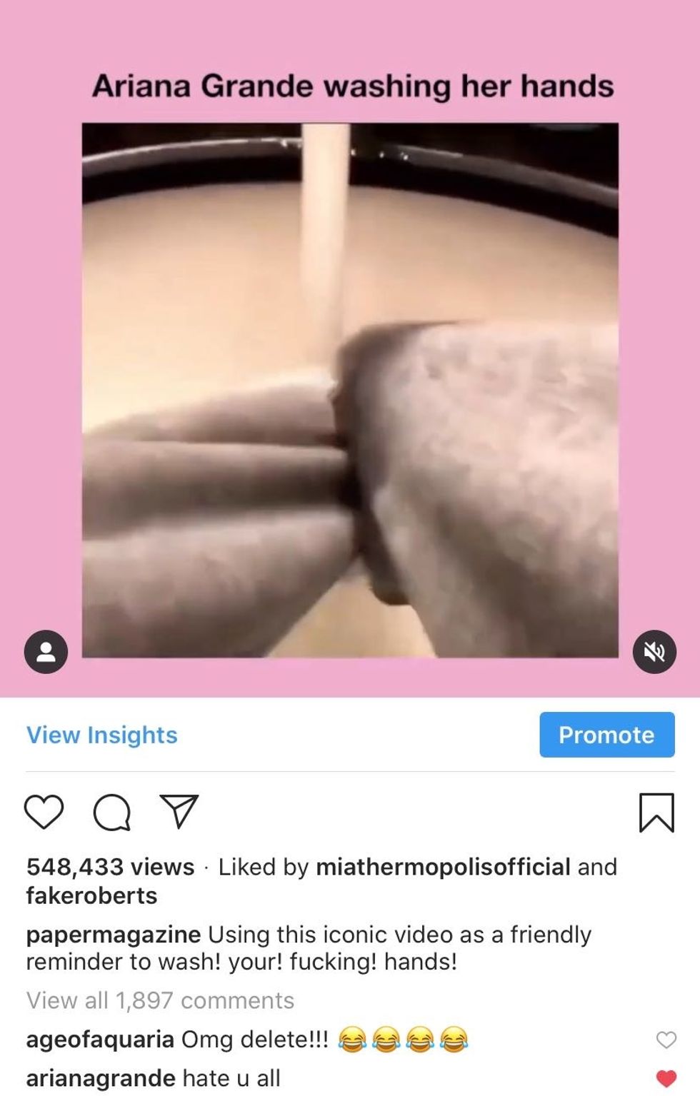 So yesterday, we posted that classic video of "Ariana Grande" washing her long sleeve-covered hands in an effort to get everyone to stick to proven sanitary practices. Granted, what we didn't expect was for Ariana herself to respond to our little joke — though we honestly shouldn't have expected any less from the verifiable queen of the comeback.