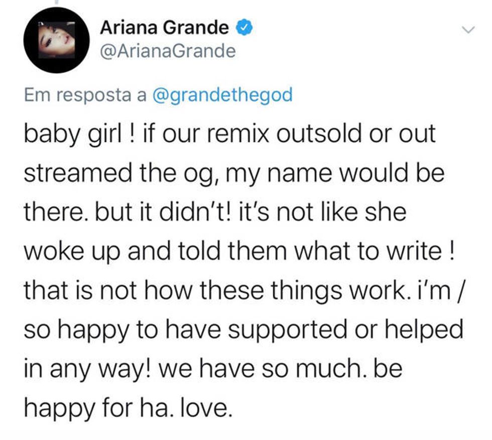 Unfortunately though, the hashtag kept trending and even got to the point where Grande reportedly had to address the issue. In what appears to be a (since-deleted) tweet obtained by PopBuzz, Grande appears to respond to a critical fan by reiterating that "if our remix outsold or out streamed the OG, my name would be there."