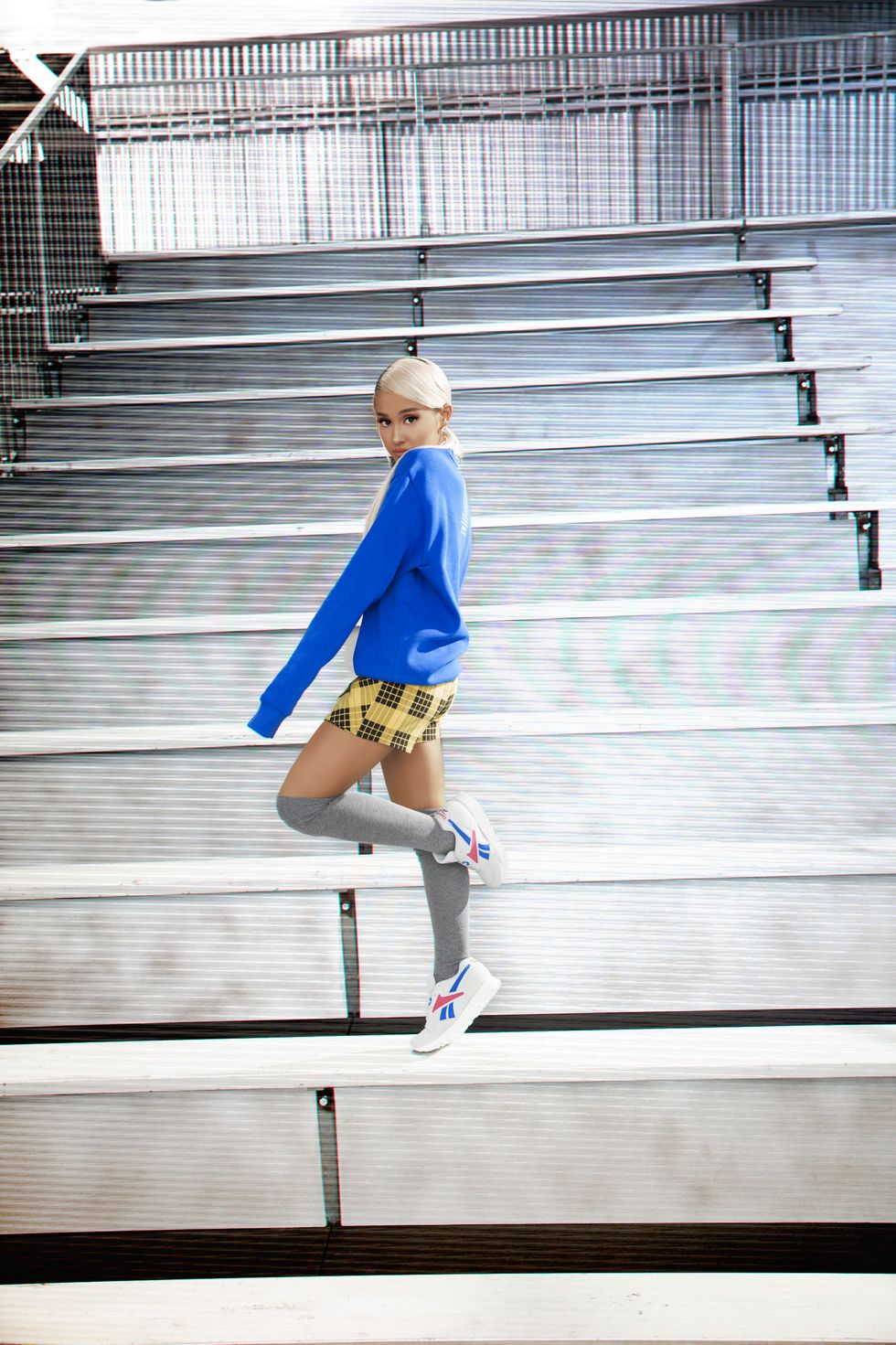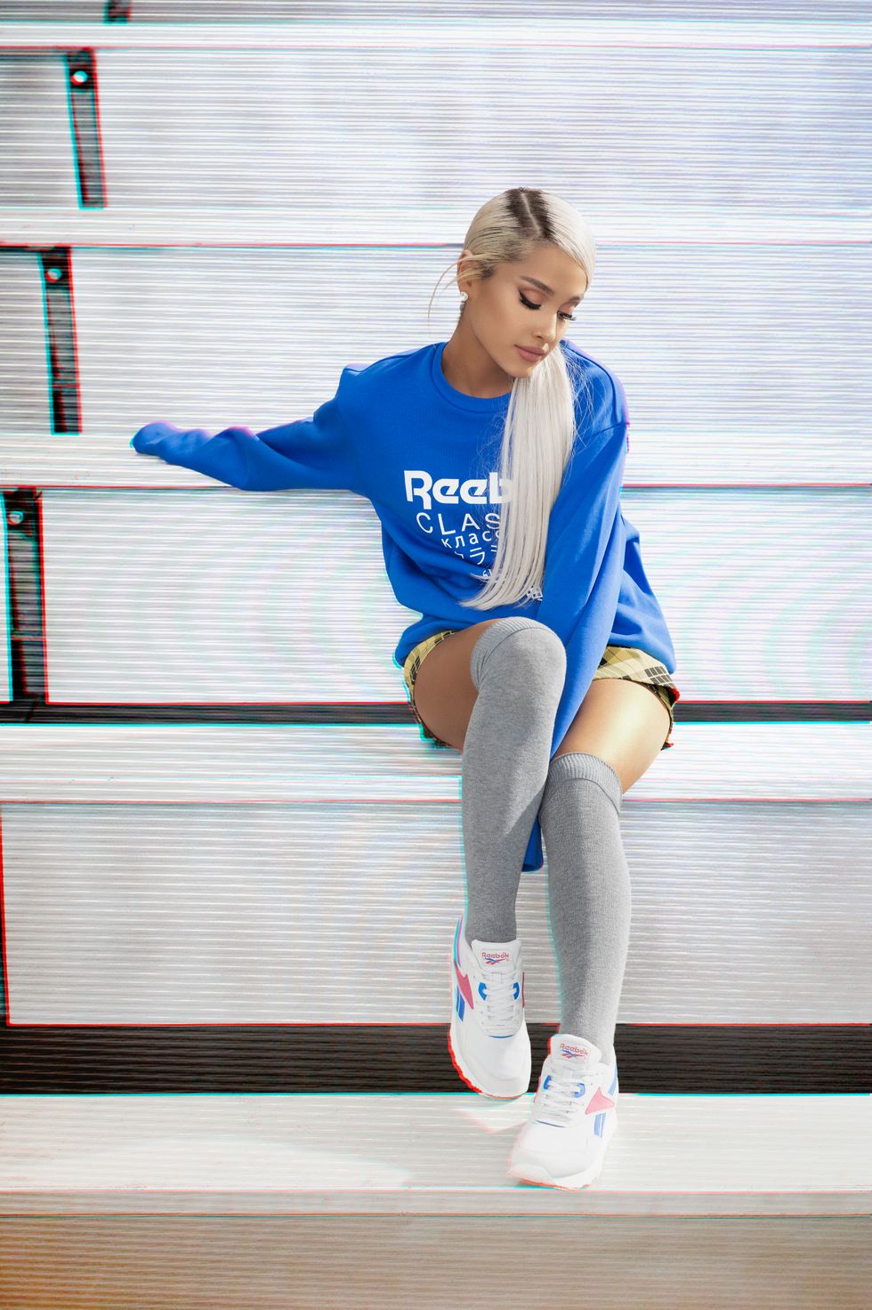 The "God Is A Woman" singer—who recently starred in Reebok's "Be More Human" campaign alongside Gigi Hadid and Gal Gadot—appears in her signature high hemline and thigh-high sock look in the campaign. Grande's short, yellow and black plaid skort (yes—she's wearing the much-contested skirt shorts hybrid) is styled with an oversized blue sweatshirt for an understated 90s throwback outfit.