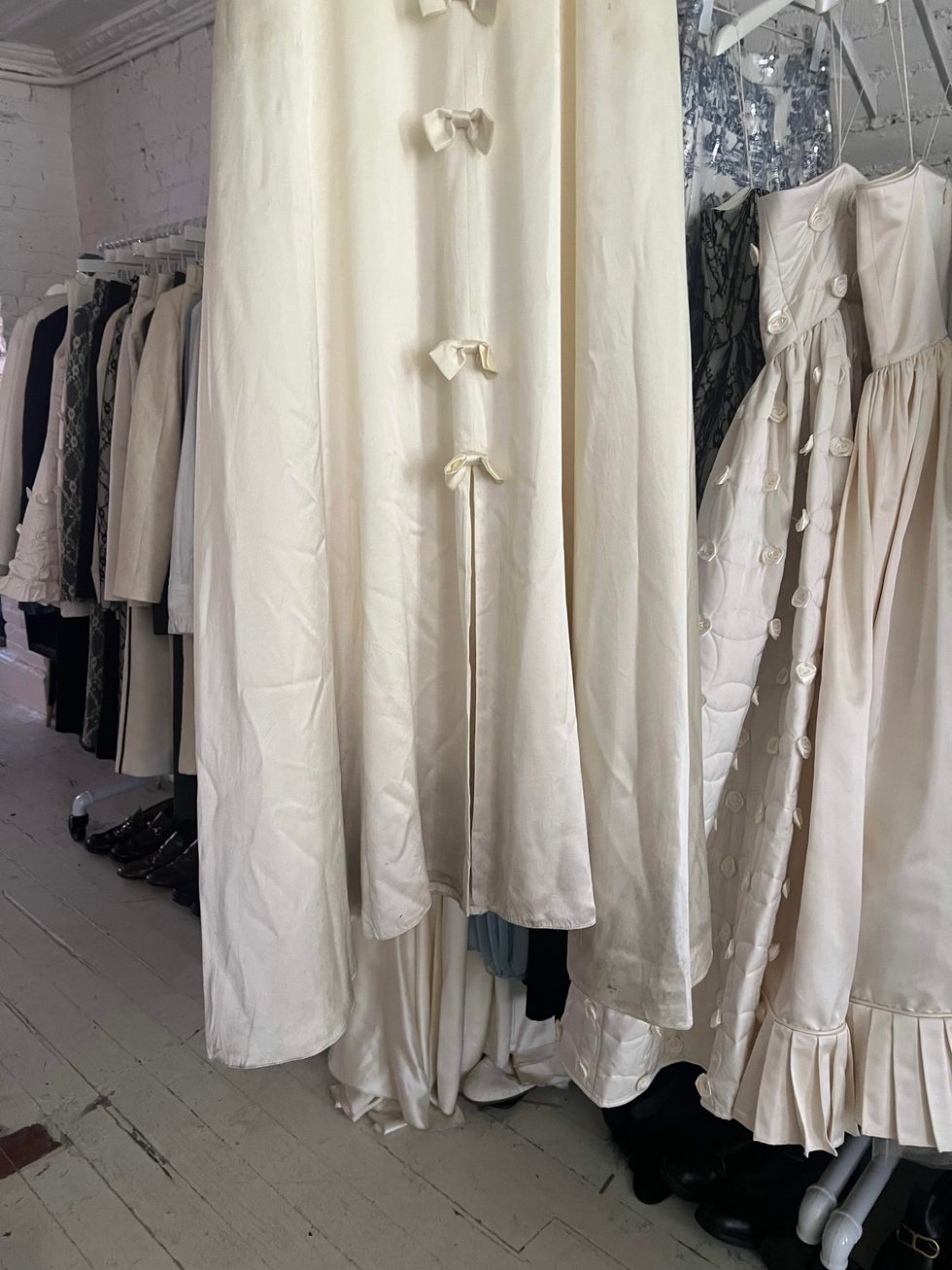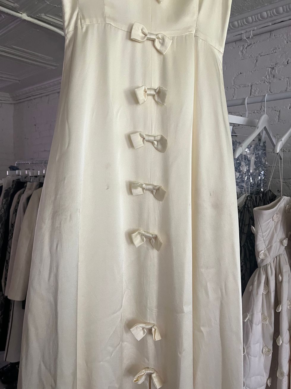 We have a star intern who's a huge Ariana Grande fan and was stalking all the hype around the album on Twitter after Wicked. He found all these little nuggets that were leaked about the video and saw the puff sleeve in a picture, and was like, "This has to be your dress." Then he found this little bow that was a part of the music video that they had cut off the dress. It was on the floor in the music video, and he was like, "This is the bow, right?" So we were pretty darn sure that it was happening. Then the music video came out, and the dress was all over in like 50 percent of the video. It's on her album cover. It's on all of her merch. We bought an album right away. I still have to buy a t-shirt, but we figured out that the reason why we didn't get the dress back was because she was trudging through like swamp water in her video. So then after the video came out, they finally were like, "You can have the dress back now." We just got it back like a week ago, and you can tell it's it's been through it. But it's a fun relic to have.