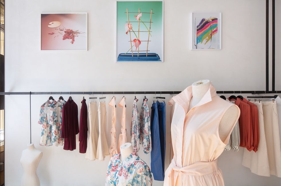 Every season I'm inspired by contemporary art or a new artist I've recently discovered," says Arias. "I've been visiting Andrew Kreps' gallery for years and the gallery is just a few blocks away from the store. I chose to showcase Kelm's works because I believe her photographs appeal to both fashion and art lovers. The photographs deconstruct traditional still life narratives focusing on the intersection of form and pattern. I love how the color story of her work and my collection play beautifully with each other and how they bring a new dimension of art and fashion to the store."