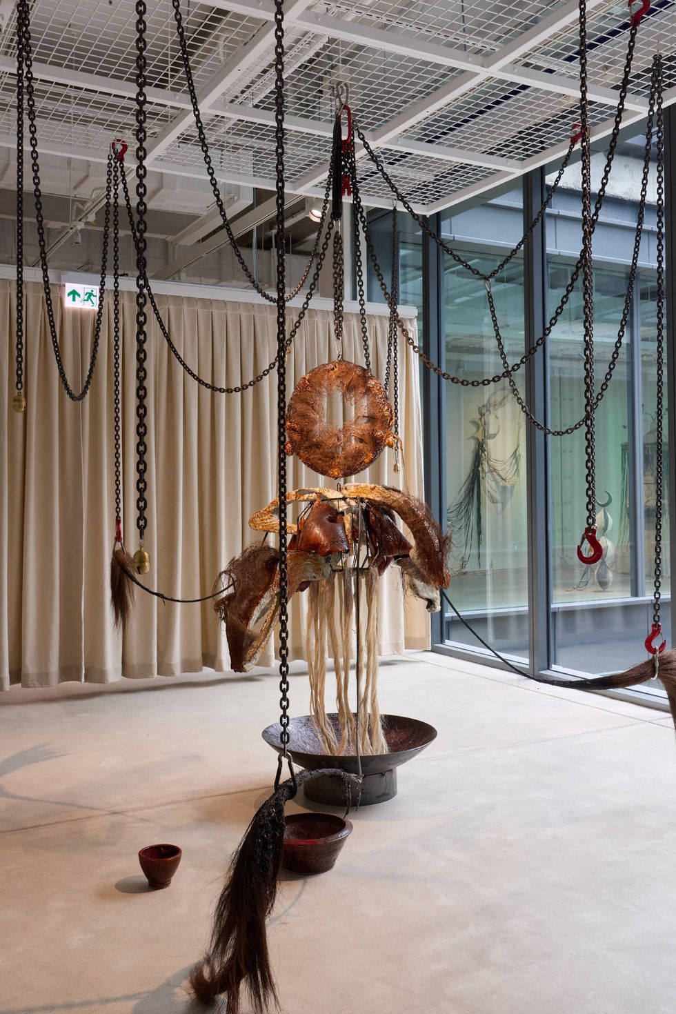 Afterwards, a friend shepherded me across town to the CHAT (Center for Heritage, Arts and Textile) museum to see Threading Inwards, a contemporary textile exhibition that pushed the medium well beyond its usual two-dimensional confines. There I met the rising artist Liu Xuan, who walked me through her piece Lilayati: a floating, octopus-like form made of brushed tree fibers that extend into tentacles suspended by chains. When activated, the sculpture bobs gently, bells chiming at its ends. The effect was vaguely eldritch, but I was entranced.